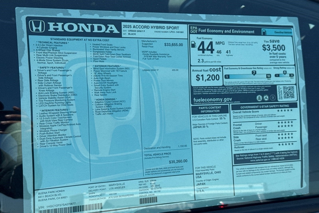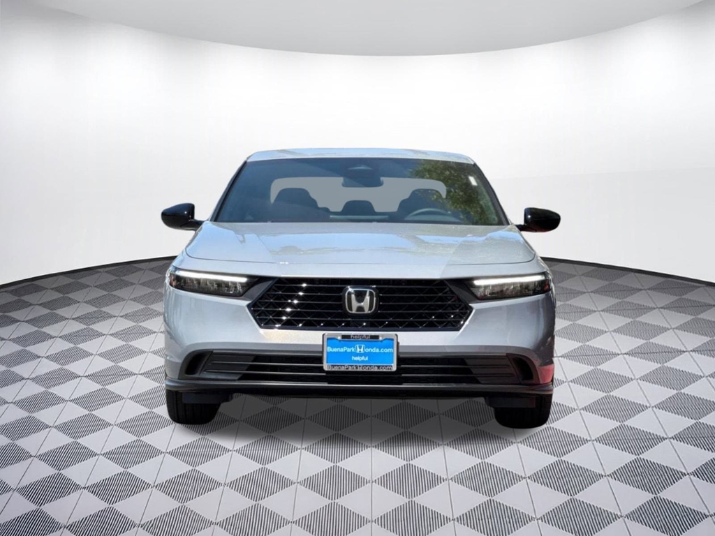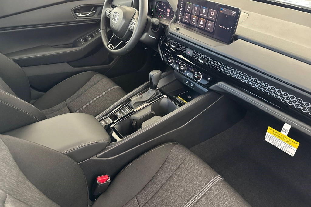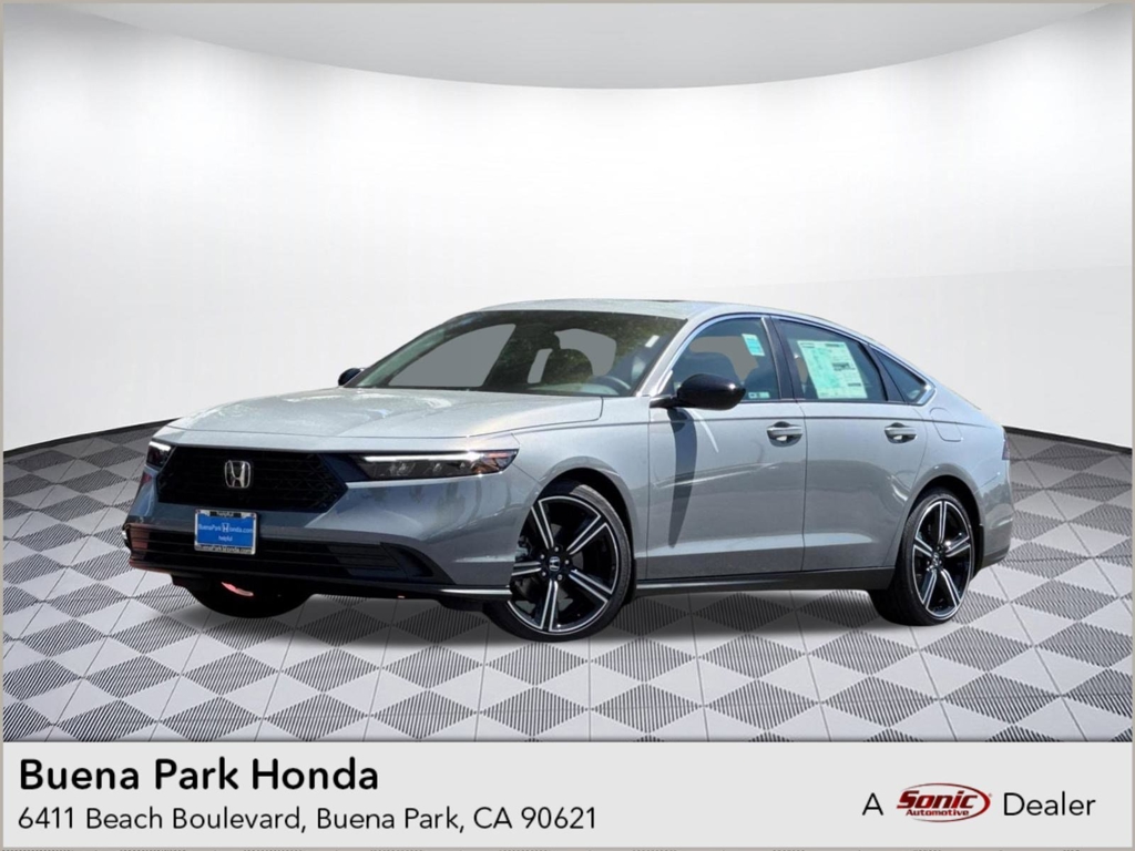 Wheels: 19' x 8.5J Berlina Black -inc: machined face, Vehicle Stability Assist (VSA) Electronic Stability Control (ESC), Valet Function, Trunk Rear Cargo Access, Trip computer, Transmission: Electronic Continuously Variable -inc: econ, normal, sport and individual modes, Traffic Jam Assist, Tires: 235/40R19 96V AS, Tire Specific Low Tire Pressure Warning, Tire mobility kit. This Honda Accord Hybrid has a powerful Gas/Electric I-4 2.0 L/122 engine powering this Variable transmission. Experience a Fully-Loaded Honda Accord Hybrid Sport Strut Front Suspension w/Coil Springs, Smart Device Remote Engine Start, Single Stainless Steel Exhaust, Side Impact Beams, Seats w/Cloth Back Material, Restricted Driving Mode/Alerts, Remote Releases -Inc: Power Cargo Access, Remote Keyless Entry w/Integrated Key Transmitter, Illuminated Entry, Illuminated Ignition Switch and Panic Button, Regenerative 4-Wheel Disc Brakes w/4-Wheel ABS, Front Vented Discs, Brake Assist, Hill Hold Control and Electric Parking Brake, Redundant Digital Speedometer, Rear Cupholder, Rear Child Safety Locks, Radio: 180-Watt Audio System -inc: 8 speakers, 12.3' color touchscreen, Alexa built-in, wired and wireless Apple CarPlay and Android Auto compatibility, Bluetooth streaming audio, 1 USB-C 3.0A smartphone/audio interface, Wi-Fi hotspot capability and HondaLink subscription services, Radio w/Seek-Scan, Clock, Speed Compensated Volume Control, Steering Wheel Controls, Voice Activation and Radio Data System, Proximity Key For Doors And Push Button Start, Power Rear Windows, Power Fuel Flap Locking Type, Power Door Locks w/Autolock Feature, Power 1st Row Windows w/Driver And Passenger 1-Touch Up/Down, Perimeter Alarm. Visit Us Today Test drive this must-see, must-drive, must-own beauty today at Buena Park Honda, 6411 Beach Blvd, Buena Park, CA 90621.