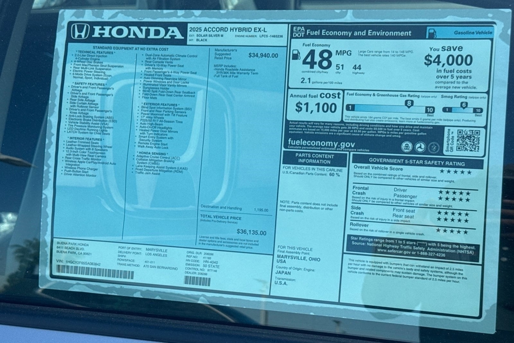 Wheels: 17' x 7.5J Pewter Gray, Vehicle Stability Assist (VSA) Electronic Stability Control (ESC), Valet Function, Trunk Rear Cargo Access, Trip computer, Transmission: Electronic Continuously Variable -inc: econ, normal, sport and individual modes, Transmission w/Driver Selectable Mode, Traffic Jam Assist, Tires: 225/50R17 94V AS, Tire Specific Low Tire Pressure Warning. This Honda Accord Hybrid has a strong Gas/Electric I-4 2.0 L/122 engine powering this Variable transmission. These Packages Will Make Your Honda Accord Hybrid EX-L The Envy of Your Friends Tire mobility kit, Strut Front Suspension w/Coil Springs, Smart Device Remote Engine Start, Smart Device Integration, Single Stainless Steel Exhaust, Side Impact Beams, Seats w/Leatherette Back Material, Restricted Driving Mode/Alerts, Remote Releases -Inc: Power Cargo Access, Remote Keyless Entry w/Integrated Key Transmitter, Illuminated Entry, Illuminated Ignition Switch and Panic Button, Regenerative 4-Wheel Disc Brakes w/4-Wheel ABS, Front Vented Discs, Brake Assist, Hill Hold Control and Electric Parking Brake, Redundant Digital Speedometer, Rear Cupholder, Rear Child Safety Locks, Radio: 180-Watt Audio System -inc: 8 speakers, 12.3' color touchscreen, Alexa built-in, wired and wireless Apple CarPlay and Android Auto compatibility, Bluetooth streaming audio, 1 USB-C 3.0A smartphone/audio interface, Wi-Fi hotspot capability and HondaLink subscription services, Radio w/Seek-Scan, Clock, Speed Compensated Volume Control, Steering Wheel Controls, Voice Activation and Radio Data System, Proximity Key For Doors And Push Button Start, Power Rear Windows, Power Fuel Flap Locking Type, Power Door Locks w/Autolock Feature. Visit Us Today Come in for a quick visit at Buena Park Honda, 6411 Beach Blvd, Buena Park, CA 90621 to claim your Honda Accord Hybrid!