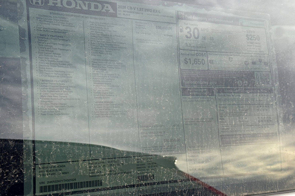 Wireless Phone Connectivity, Wheels: 18' Shark Gray, Valet Function, Trunk/Hatch Auto-Latch, Trip Computer, Transmission: Continuously Variable Automatic -inc: normal, econ and snow dynamic drive modes, Transmission w/Driver Selectable Mode, Traffic Jam Assist, Tires: 235/60R18 103H All-Season, Tailgate/Rear Door Lock Included w/Power Door Locks. This Honda CR-V has a dependable Intercooled Turbo Regular Unleaded I-4 1.5 L/91 engine powering this Variable transmission. These Packages Will Make Your Honda CR-V EX-L The Envy of Your Friends Strut Front Suspension w/Coil Springs, Steel Spare Wheel, Smart Device Integration, Side Impact Beams, Seats w/Leatherette Back Material, Remote Releases -Inc: Power Cargo Access, Remote Keyless Entry w/Integrated Key Transmitter, Illuminated Entry, Illuminated Ignition Switch and Panic Button, Rear Cupholder, Rear Cross Traffic Monitor (CTM)/Low Speed Braking Control, Rear Child Safety Locks, Radio w/Seek-Scan, Clock, Speed Compensated Volume Control, Steering Wheel Controls, Voice Activation, Radio Data System and External Memory Control, Quasi-Dual Stainless Steel Exhaust, Proximity Key For Doors And Push Button Start, Power Rear Windows and Fixed 3rd Row Windows, Power Liftgate Rear Cargo Access, Power Door Locks w/Autolock Feature, Power 1st Row Windows w/Front And Rear 1-Touch Up/Down, Perimeter/Approach Lights, Perimeter Alarm, Passenger Seat. Stop By Today A short visit to Buena Park Honda located at 6411 Beach Blvd, Buena Park, CA 90621 can get you a trustworthy CR-V today!