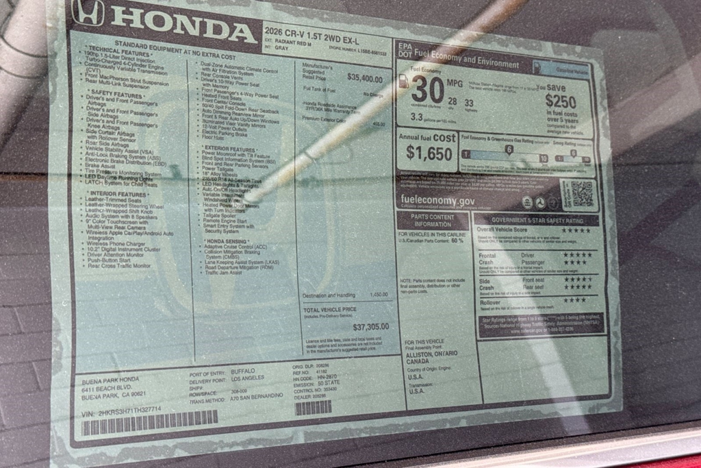 Wireless Phone Connectivity, Wheels: 18' Shark Gray, Valet Function, Trunk/Hatch Auto-Latch, Trip Computer, Transmission: Continuously Variable Automatic -inc: normal, econ and snow dynamic drive modes, Transmission w/Driver Selectable Mode, Traffic Jam Assist, Tires: 235/60R18 103H All-Season, Tailgate/Rear Door Lock Included w/Power Door Locks. This Honda CR-V has a dependable Intercooled Turbo Regular Unleaded I-4 1.5 L/91 engine powering this Variable transmission. Experience a Fully-Loaded Honda CR-V EX-L Strut Front Suspension w/Coil Springs, Steel Spare Wheel, Smart Device Integration, Side Impact Beams, Seats w/Leatherette Back Material, Remote Releases -Inc: Power Cargo Access, Remote Keyless Entry w/Integrated Key Transmitter, Illuminated Entry, Illuminated Ignition Switch and Panic Button, Rear Cupholder, Rear Cross Traffic Monitor (CTM)/Low Speed Braking Control, Rear Child Safety Locks, Radio w/Seek-Scan, Clock, Speed Compensated Volume Control, Steering Wheel Controls, Voice Activation, Radio Data System and External Memory Control, Quasi-Dual Stainless Steel Exhaust, Proximity Key For Doors And Push Button Start, Power Rear Windows and Fixed 3rd Row Windows, Power Liftgate Rear Cargo Access, Power Door Locks w/Autolock Feature, Power 1st Row Windows w/Front And Rear 1-Touch Up/Down, Perimeter/Approach Lights, Perimeter Alarm, Passenger Seat. Visit Us Today You've earned this- stop by Buena Park Honda located at 6411 Beach Blvd, Buena Park, CA 90621 to make this car yours today!