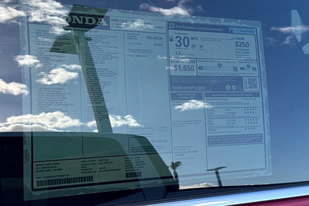 Wireless Phone Connectivity, Wheels: 18' Shark Gray, Valet Function, Trunk/Hatch Auto-Latch, Trip Computer, Transmission: Continuously Variable Automatic -inc: normal, econ and snow dynamic drive modes, Transmission w/Driver Selectable Mode, Traffic Jam Assist, Tires: 235/60R18 103H All-Season, Tailgate/Rear Door Lock Included w/Power Door Locks. This Honda CR-V has a dependable Intercooled Turbo Regular Unleaded I-4 1.5 L/91 engine powering this Variable transmission. These Packages Will Make Your Honda CR-V EX-L The Envy of Your Friends Strut Front Suspension w/Coil Springs, Steel Spare Wheel, Smart Device Integration, Side Impact Beams, Seats w/Leatherette Back Material, Remote Releases -Inc: Power Cargo Access, Remote Keyless Entry w/Integrated Key Transmitter, Illuminated Entry, Illuminated Ignition Switch and Panic Button, Rear Cupholder, Rear Cross Traffic Monitor (CTM)/Low Speed Braking Control, Rear Child Safety Locks, Radio w/Seek-Scan, Clock, Speed Compensated Volume Control, Steering Wheel Controls, Voice Activation, Radio Data System and External Memory Control, Quasi-Dual Stainless Steel Exhaust, Proximity Key For Doors And Push Button Start, Power Rear Windows and Fixed 3rd Row Windows, Power Liftgate Rear Cargo Access, Power Door Locks w/Autolock Feature, Power 1st Row Windows w/Front And Rear 1-Touch Up/Down, Perimeter/Approach Lights, Perimeter Alarm, Passenger Seat. Stop By Today Test drive this must-see, must-drive, must-own beauty today at Buena Park Honda, 6411 Beach Blvd, Buena Park, CA 90621.
