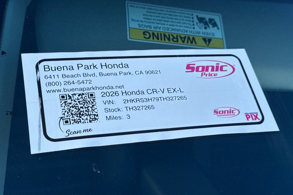 Wireless Phone Connectivity, Wheels: 18' Shark Gray, Valet Function, Trunk/Hatch Auto-Latch, Trip Computer, Transmission: Continuously Variable Automatic -inc: normal, econ and snow dynamic drive modes, Transmission w/Driver Selectable Mode, Traffic Jam Assist, Tires: 235/60R18 103H All-Season, Tailgate/Rear Door Lock Included w/Power Door Locks. This Honda CR-V has a powerful Intercooled Turbo Regular Unleaded I-4 1.5 L/91 engine powering this Variable transmission. This Honda CR-V EX-L Has Everything You Want Strut Front Suspension w/Coil Springs, Steel Spare Wheel, Smart Device Integration, Side Impact Beams, Seats w/Leatherette Back Material, Remote Releases -Inc: Power Cargo Access, Remote Keyless Entry w/Integrated Key Transmitter, Illuminated Entry, Illuminated Ignition Switch and Panic Button, Rear Cupholder, Rear Cross Traffic Monitor (CTM)/Low Speed Braking Control, Rear Child Safety Locks, Radio w/Seek-Scan, Clock, Speed Compensated Volume Control, Steering Wheel Controls, Voice Activation, Radio Data System and External Memory Control, Quasi-Dual Stainless Steel Exhaust, Proximity Key For Doors And Push Button Start, Power Rear Windows and Fixed 3rd Row Windows, Power Liftgate Rear Cargo Access, Power Door Locks w/Autolock Feature, Power 1st Row Windows w/Front And Rear 1-Touch Up/Down, Perimeter/Approach Lights, Perimeter Alarm, Passenger Seat. Stop By Today For a must-own Honda CR-V come see us at Buena Park Honda, 6411 Beach Blvd, Buena Park, CA 90621. Just minutes away!