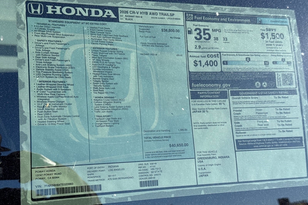 Wheels: 18' Shark Gray, Vehicle Stability Assist (VSA) Electronic Stability Control (ESC), Valet Function, Trip Computer, Transmission: Electronic Continuously Variable -inc: sport, normal, econ and snow dynamic drive modes, Traffic Jam Assist, Tires: 235/60R18 107V All-Terrain, Tire mobility kit, Tailgate/Rear Door Lock Included w/Power Door Locks, Strut Front Suspension w/Coil Springs. This Honda CR-V Hybrid has a powerful Gas/Electric I-4 2.0 L/122 engine powering this Variable transmission. These Packages Will Make Your Honda CR-V Hybrid TrailSport The Envy of Your Friends Side Impact Beams, Seats w/Cloth Back Material, Remote Keyless Entry w/Integrated Key Transmitter, Illuminated Entry, Illuminated Ignition Switch and Panic Button, Regenerative 4-Wheel Disc Brakes w/4-Wheel ABS, Front Vented Discs, Brake Assist, Hill Descent Control, Hill Hold Control and Electric Parking Brake, Rear Cupholder, Rear Cross Traffic Monitor (CTM)/Low Speed Braking Control, Rear Child Safety Locks, Radio w/Seek-Scan, Clock, Speed Compensated Volume Control, Steering Wheel Controls, Voice Activation and Radio Data System, Quasi-Dual Stainless Steel Exhaust w/Chrome Tailpipe Finisher, Proximity Key For Doors And Push Button Start, Power Rear Windows and Fixed 3rd Row Windows, Power Door Locks w/Autolock Feature, Power 1st Row Windows w/Driver And Passenger 1-Touch Up/Down, Permanent Locking Hubs, Perimeter/Approach Lights, Perimeter Alarm, Outside Temp Gauge, Outboard Front Lap And Shoulder Safety Belts -inc: Rear Center 3 Point, Height Adjusters and Pretensioners, Multi-Link Rear Suspension w/Coil Springs, Mobile Hotspot Internet Access. Visit Us Today Stop by Poway Honda located at 13747 Poway Rd, Poway, CA 92064 for a quick visit and a great vehicle!