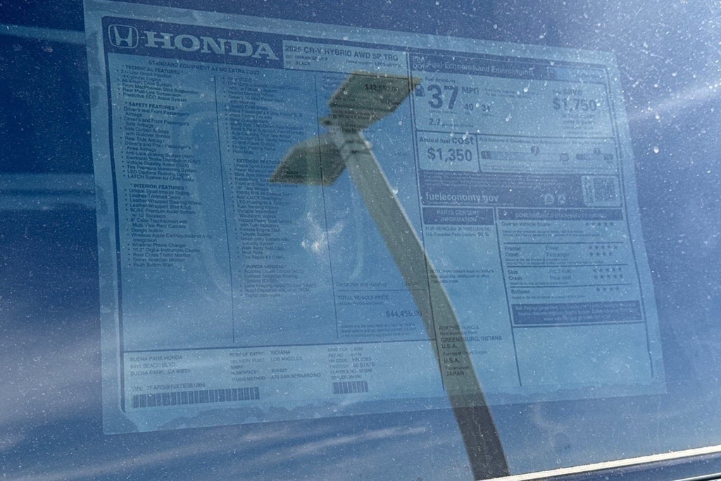 Wireless Phone Connectivity, Wheels: 19' Berlina Black, Voice Activated Dual Zone Front Automatic Air Conditioning, Vehicle Stability Assist (VSA) Electronic Stability Control (ESC), Valet Function, Trunk/Hatch Auto-Latch, Trip Computer, Transmission: Electronic Continuously Variable -inc: sport, normal, econ and snow dynamic drive modes, Transmission w/Driver Selectable Mode, Traffic Jam Assist. This Honda CR-V Hybrid has a dependable Gas/Electric I-4 2.0 L/122 engine powering this Variable transmission. Experience a Fully-Loaded Honda CR-V Hybrid Sport Touring Tracker System, Tires: 235/55R19 101H All-Season, Tire Mobility Kit, Tailgate/Rear Door Lock Included w/Power Door Locks, Strut Front Suspension w/Coil Springs, Smart Device Remote Engine Start, Smart Device Integration, Side Impact Beams, Seats w/Leatherette Back Material, Remote Releases -Inc: Proximity Cargo Access, Remote Keyless Entry w/Integrated Key Transmitter, Illuminated Entry, Illuminated Ignition Switch and Panic Button, Regenerative 4-Wheel Disc Brakes w/4-Wheel ABS, Front Vented Discs, Brake Assist, Hill Descent Control, Hill Hold Control and Electric Parking Brake, Rear Cupholder, Rear Cross Traffic Monitor (CTM)/Low Speed Braking Control, Rear Child Safety Locks, Real-Time Traffic Display, Radio: Bose Premium Sound System -inc: 9' color touchscreen, 12 speakers, HD Radio, wireless Apple CarPlay and Android Auto compatibility, Google built-in (includes 3-years unlimited data plan for in-vehicle apps) and Bluetooth streaming audio, Radio w/Seek-Scan, Clock, Speed Compensated Volume Control, Steering Wheel Controls, Voice Activation, Radio Data System and External Memory Control, Quasi-Dual Stainless Steel Exhaust w/Chrome Tailpipe Finisher, Proximity Key For Doors And Push Button Start. Visit Us Today Come in for a quick visit at Buena Park Honda, 6411 Beach Blvd, Buena Park, CA 90621 to claim your Honda CR-V Hybrid!