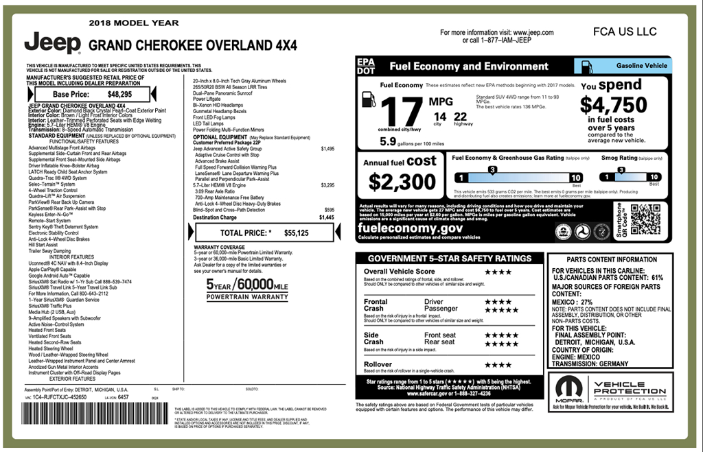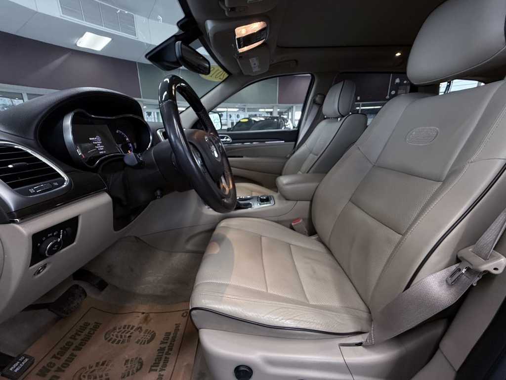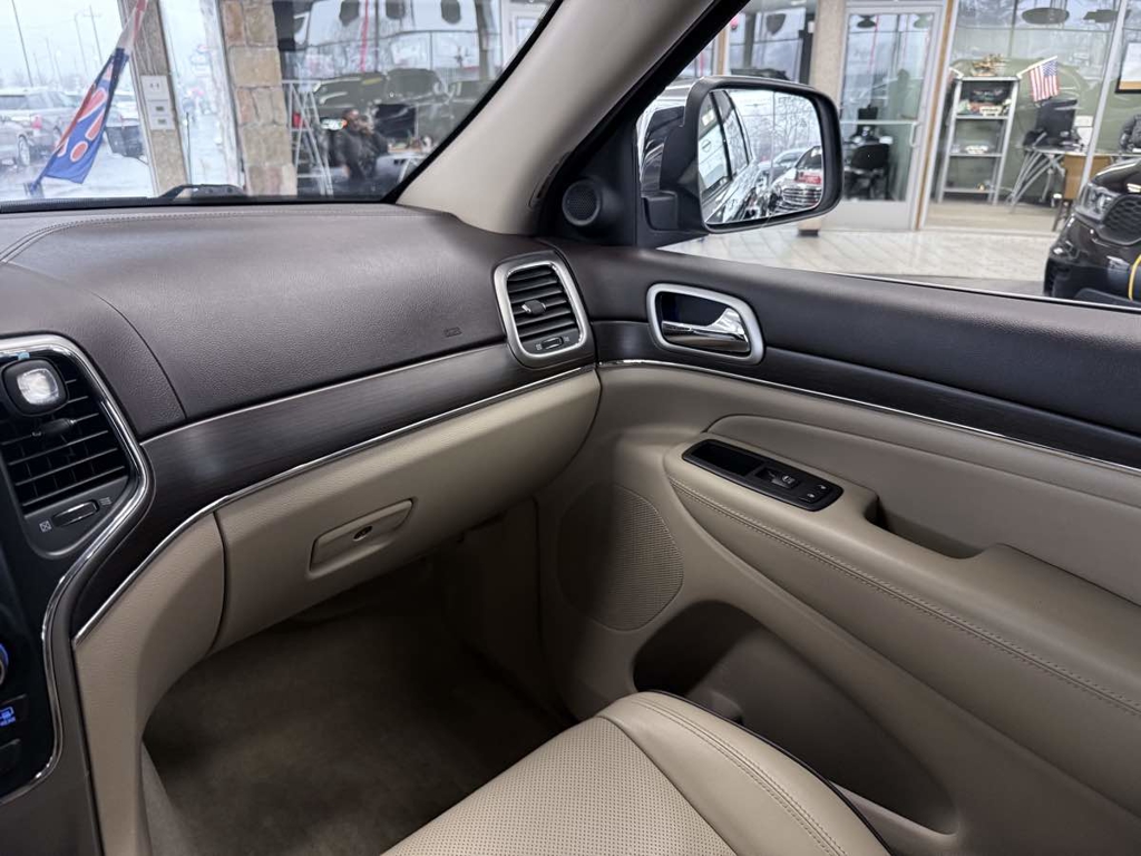 The 2018 Jeep Grand Cherokee Overland 4x4, cloaked in a sophisticated Diamond Black Crystal Pearlcoat, epitomizes robust elegance blended with high-powered performance. This formidable SUV houses a 5.7L 8-cylinder engine, providing exceptional power and capability that’s perfect for both urban commutes and off-road adventures. Its four-wheel-drive system coupled with a 3.09 rear axle ratio ensures optimal traction and control, making it a reliable partner in diverse terrains. The exterior design of this Overland edition exudes strength and style, accentuated by its sleek lines and rugged presence.