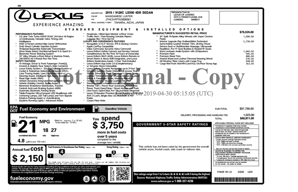This 2019 Lexus LS 500 AWD represents the pinnacle of luxury, performance, and craftsmanship. Finished in Manganese Luster, a premium and highly sought-after color, over a beautifully appointed Black leather interior with Art Wood Organic Trim, this LS 500 delivers an exceptional presence both inside and out.