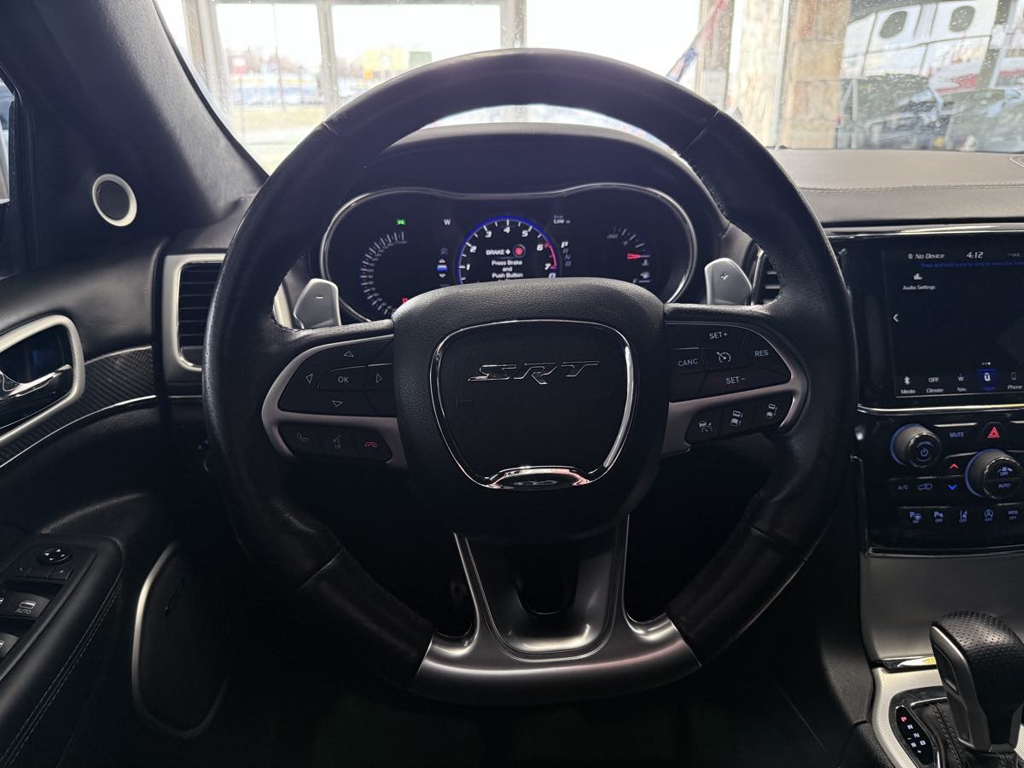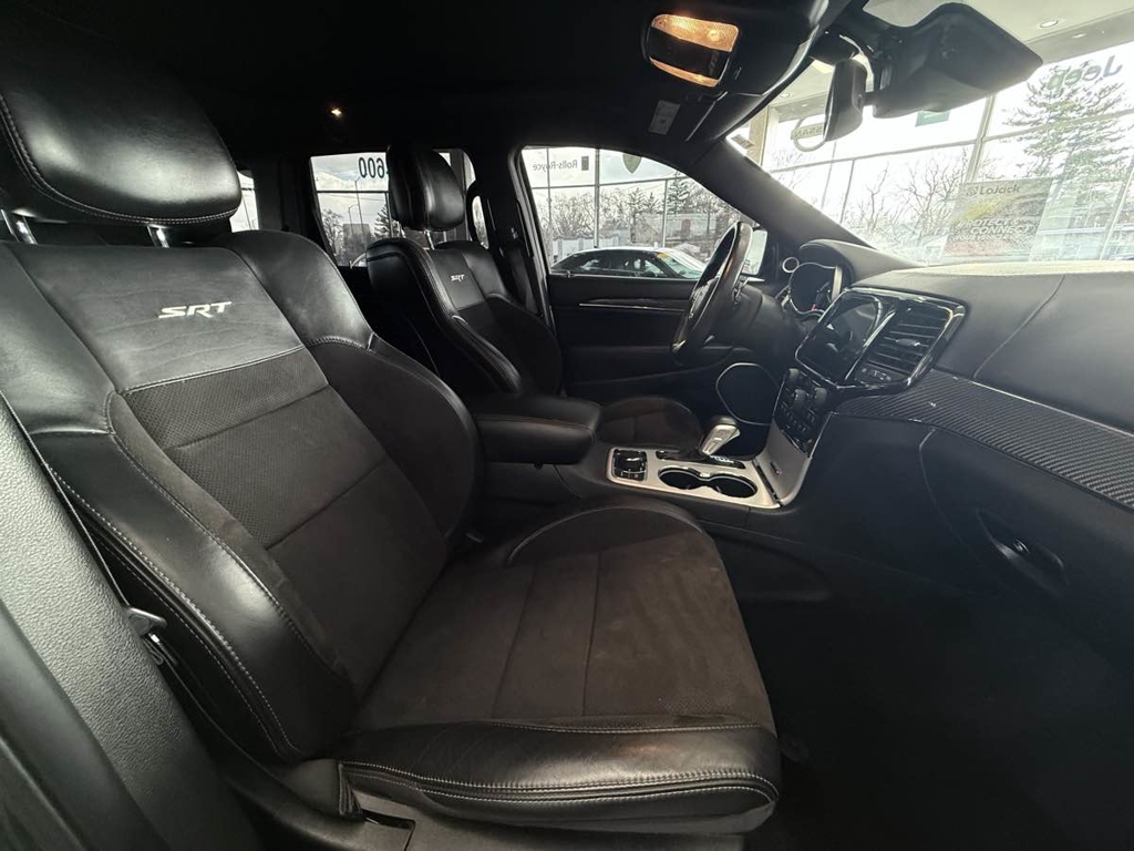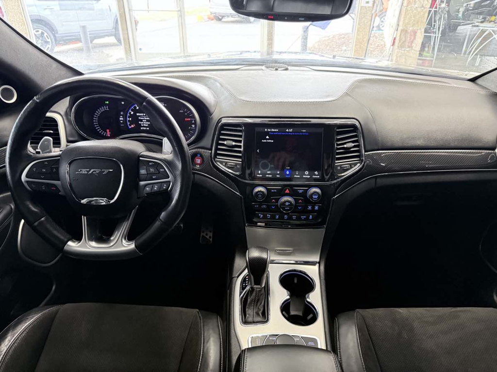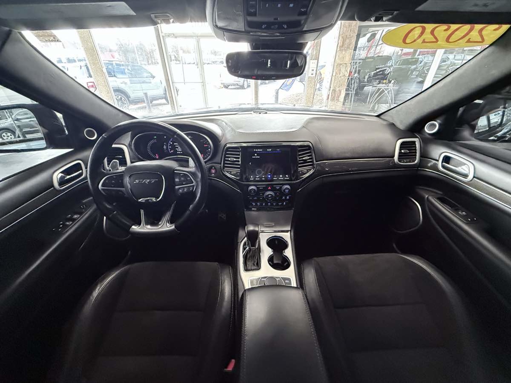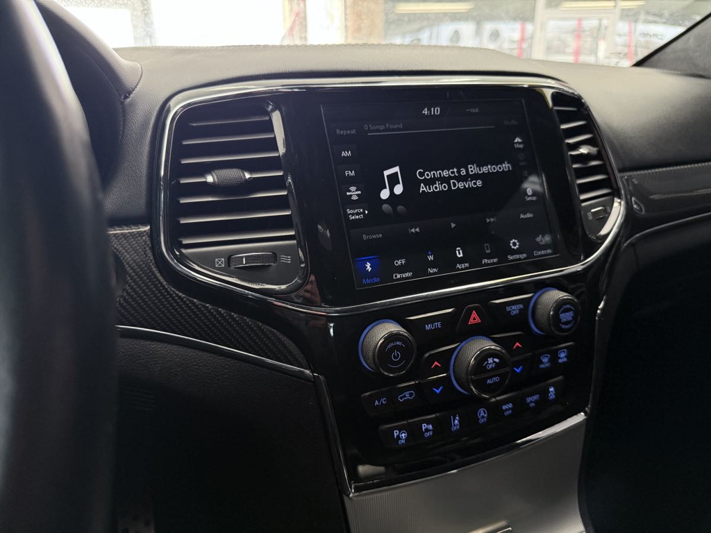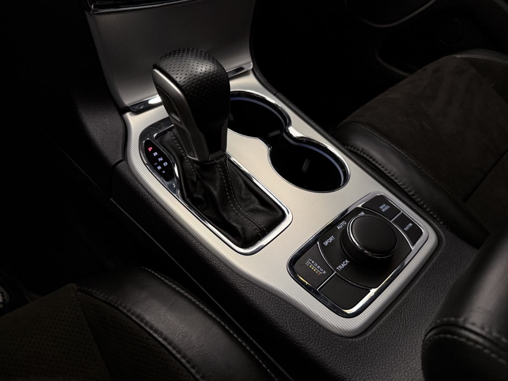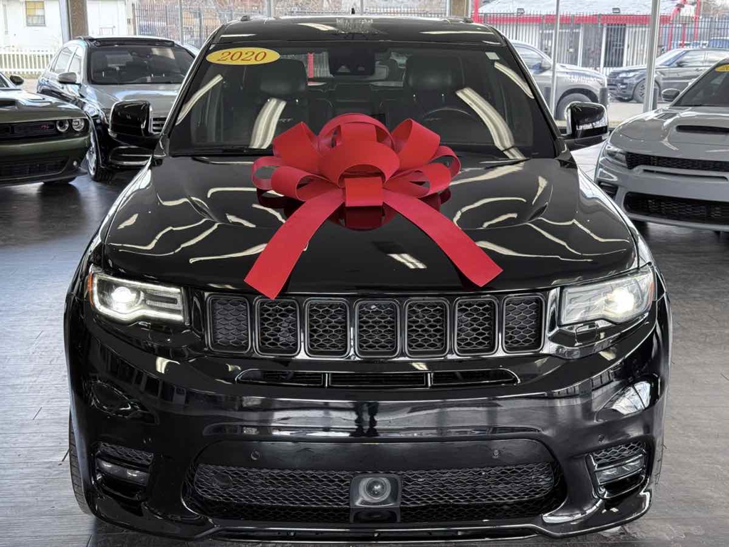The 2020 Jeep Grand Cherokee SRT 4x4 in Diamond Black Crystal Pearl exudes an unmistakable aura of power and sophistication. Its commanding presence is matched by the potent 6.4L V8 engine, delivering a heart-pounding experience with every drive. The bold exterior is accentuated by 20" x 10" semi-gloss black aluminum wheels, offering an aggressive stance that hints at its high-performance capabilities.