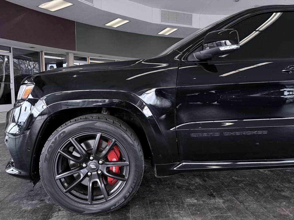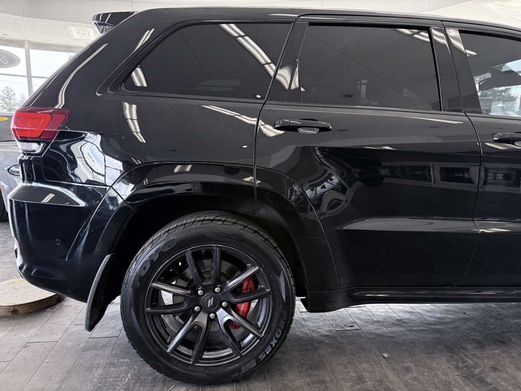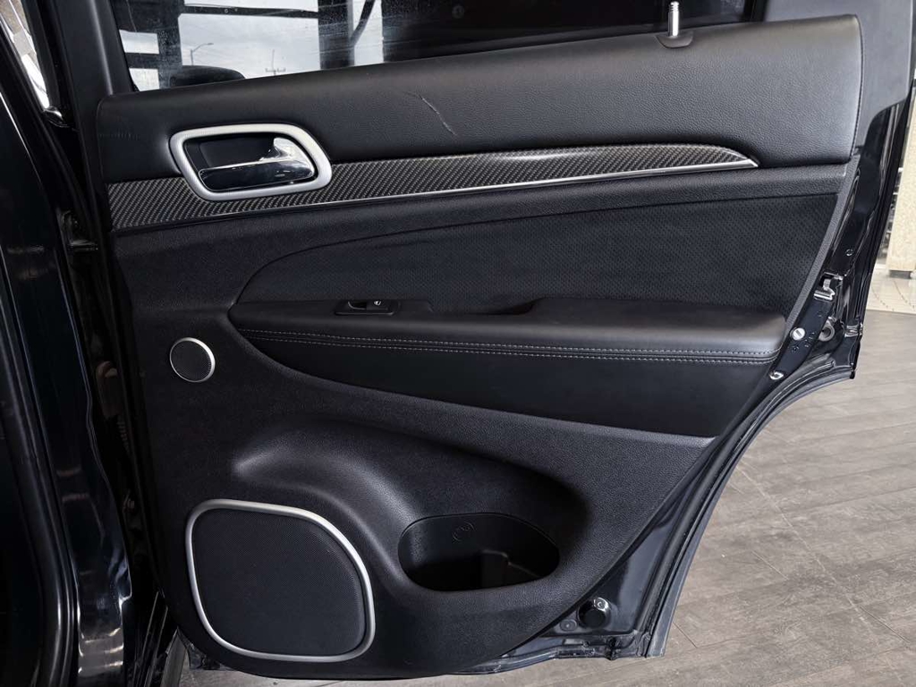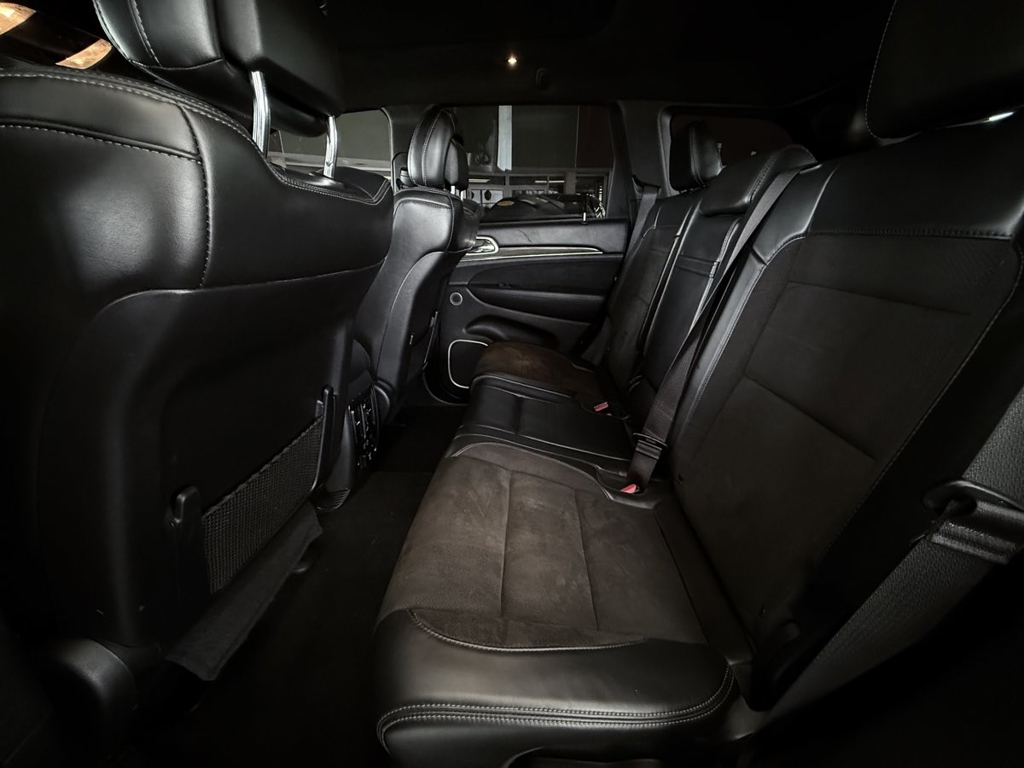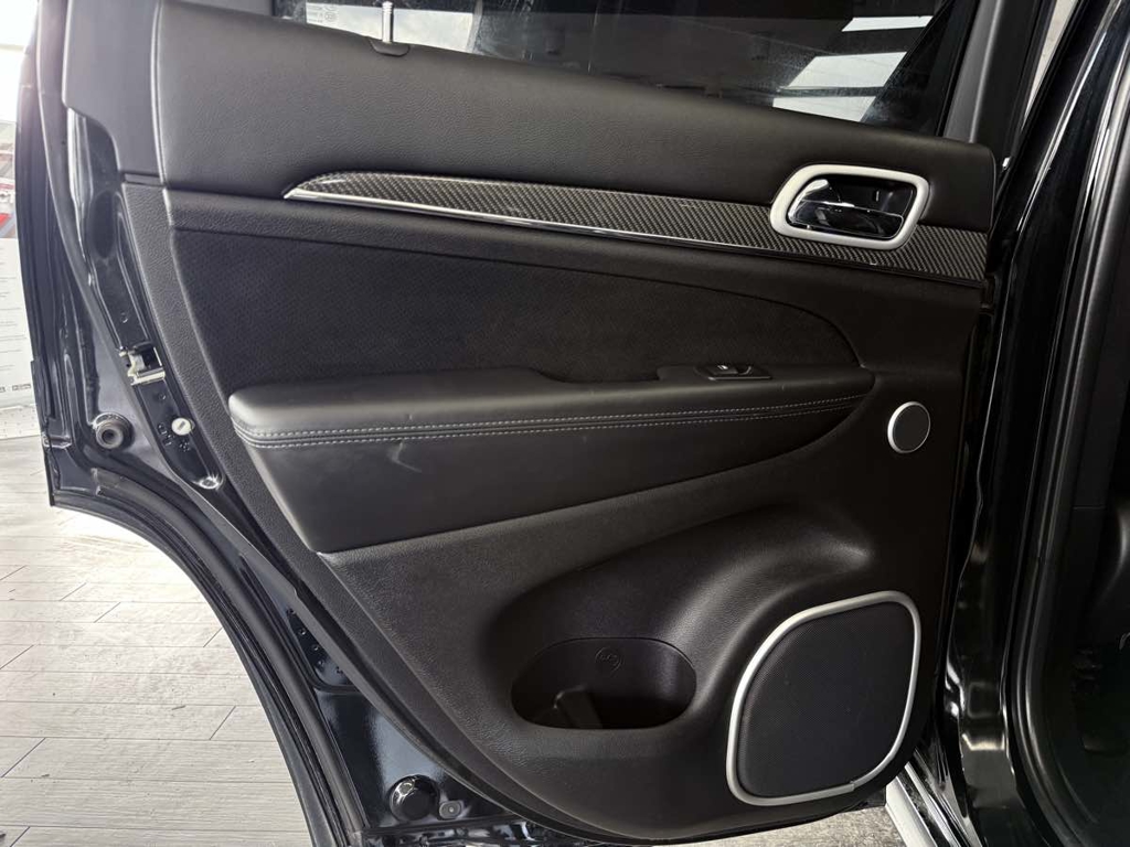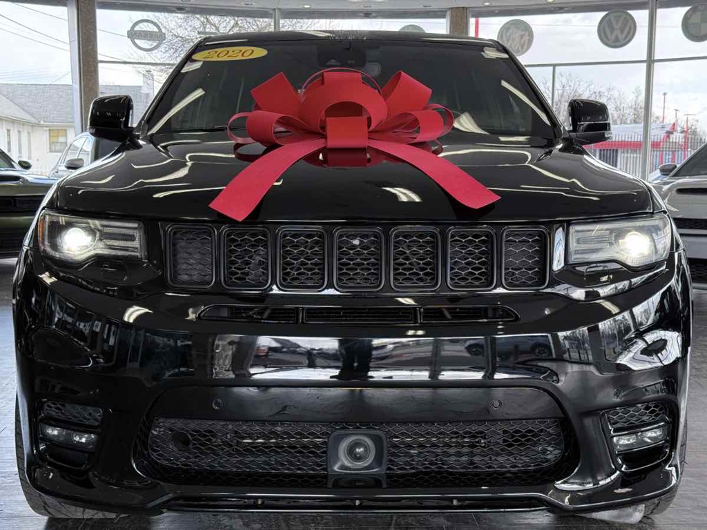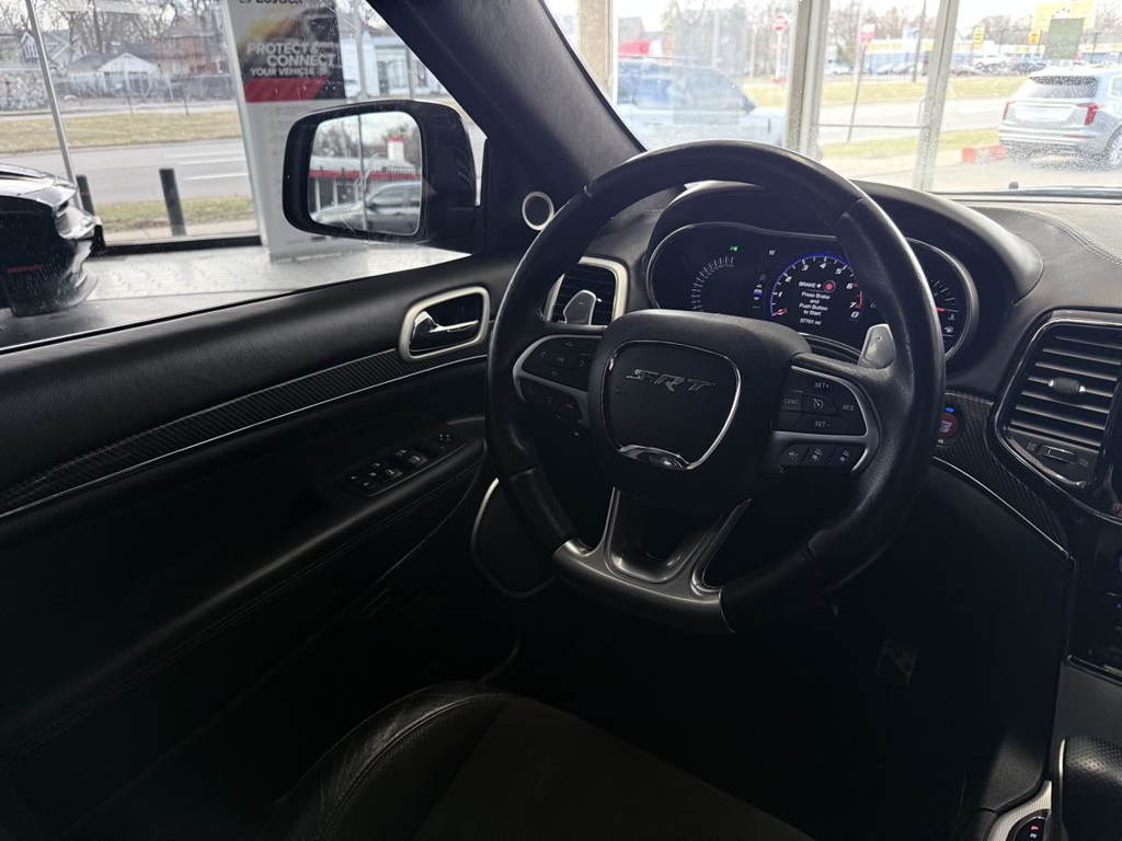 The 2020 Jeep Grand Cherokee SRT 4x4 in Diamond Black Crystal Pearl exudes an unmistakable aura of power and sophistication. Its commanding presence is matched by the potent 6.4L V8 engine, delivering a heart-pounding experience with every drive. The bold exterior is accentuated by 20" x 10" semi-gloss black aluminum wheels, offering an aggressive stance that hints at its high-performance capabilities.