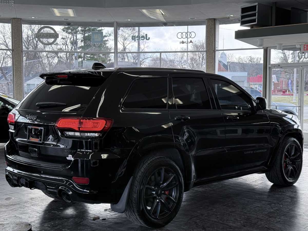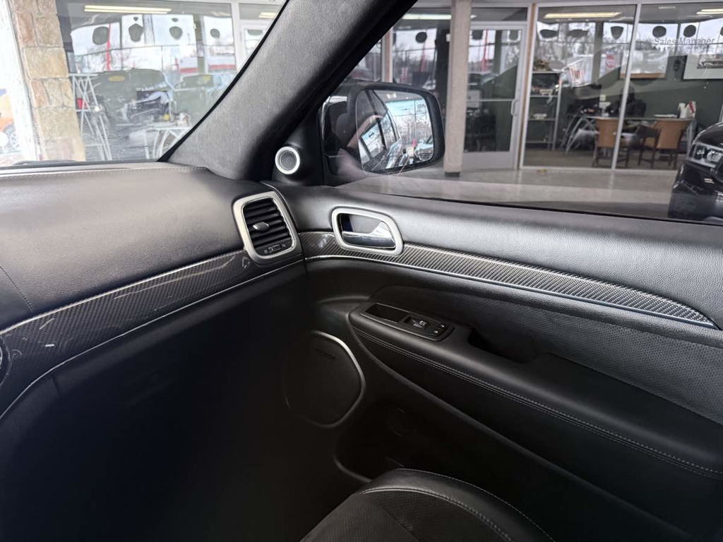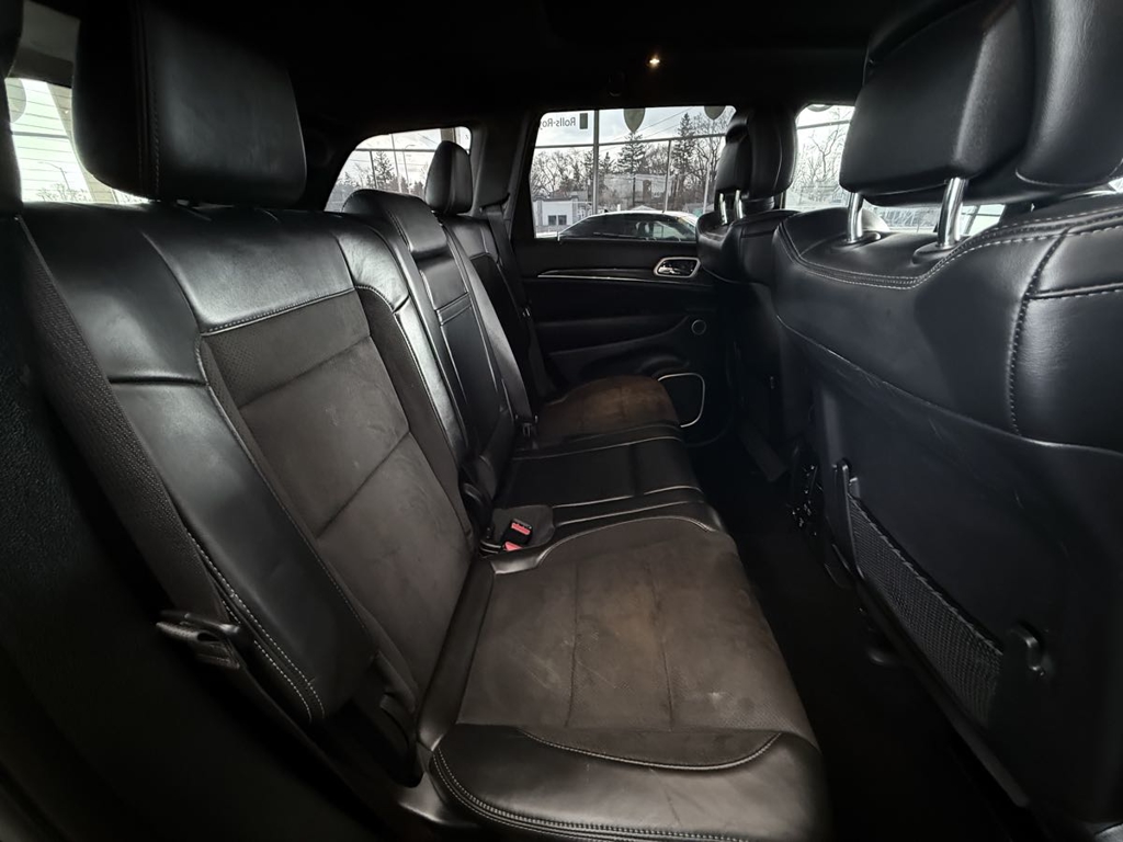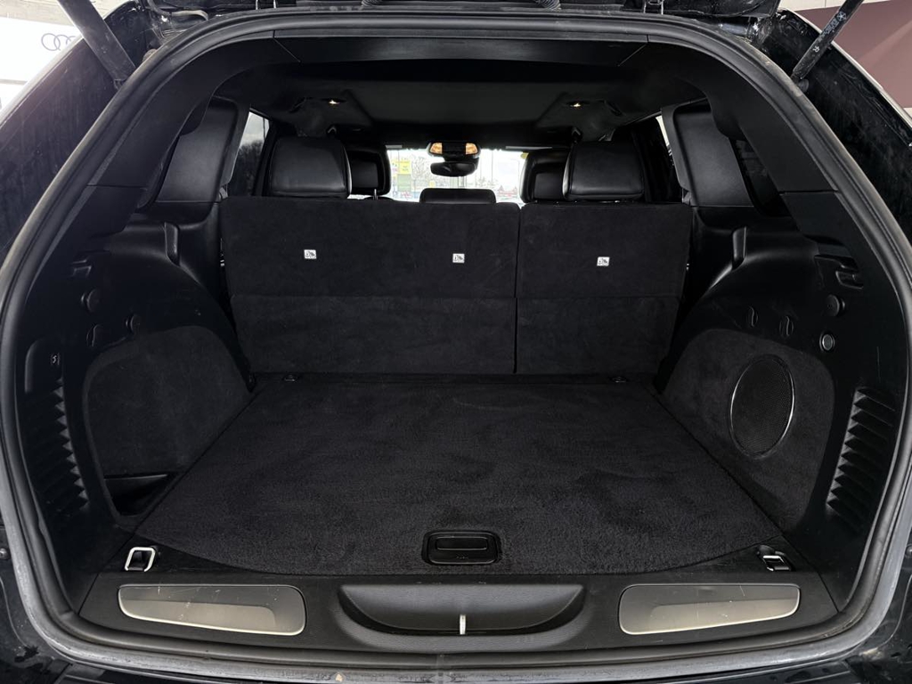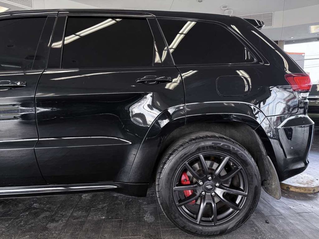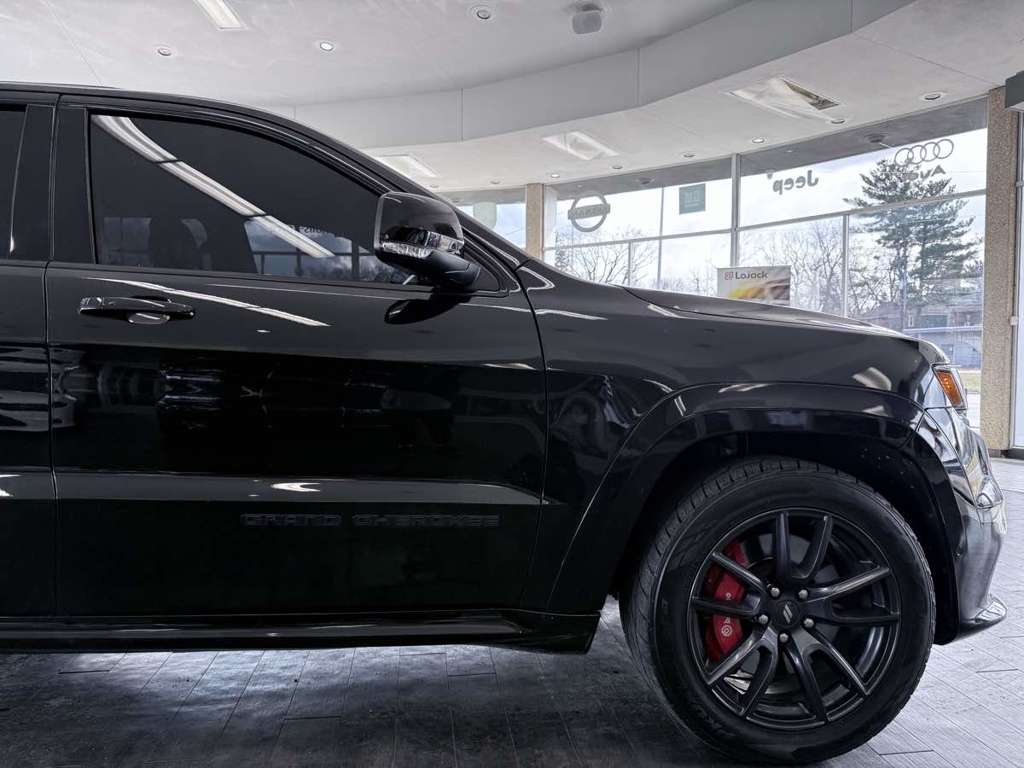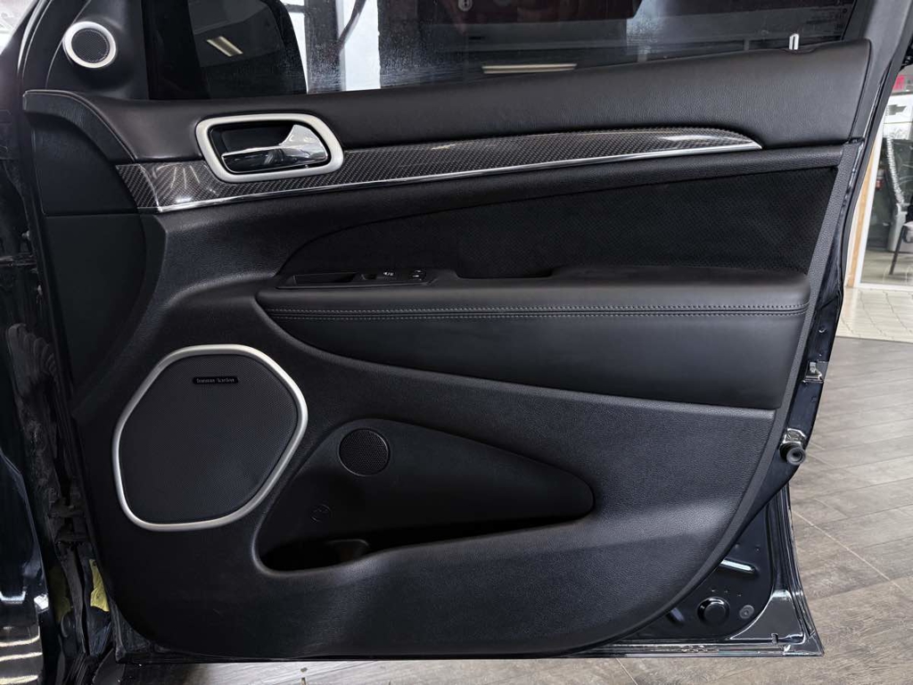 The 2020 Jeep Grand Cherokee SRT 4x4 in Diamond Black Crystal Pearl exudes an unmistakable aura of power and sophistication. Its commanding presence is matched by the potent 6.4L V8 engine, delivering a heart-pounding experience with every drive. The bold exterior is accentuated by 20" x 10" semi-gloss black aluminum wheels, offering an aggressive stance that hints at its high-performance capabilities.