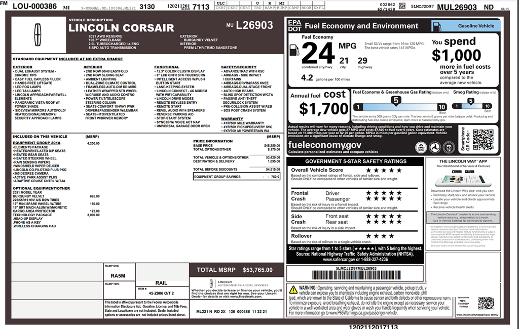 Our stunning 2021 Lincoln Corsair Reserve AWD has a daring design that definitely stands out in Burgundy Velvet! Powered by a TurboCharged 2.0 Liter EcoBoost 4 Cylinder offering 250hp tethered to a paddle-shifted 8 Speed Automatic transmission that puts premium capability at your command. Enjoy everyday adventures, weekend getaways, and just about everything in between with this All Wheel Drive SUV that adds responsive handling and scores nearly 29mpg on the highway. Attract attention even standing still with our Lincoln Corsair's sculpted design, LED lighting, fog lamps, a panoramic sunroof, a hands-free liftgate, and alloy wheels.