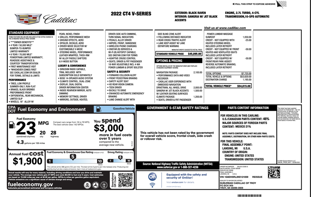 The 2022 Cadillac CT4-V 4dr Sdn embodies a perfect blend of luxury and performance, presented in a stunning Black Raven exterior that exudes sleek sophistication. Its Sangria interior, adorned with premium leather seating surfaces featuring mini-perforated inserts, offers an opulent contrast and a remarkably comfortable driving experience. The vehicle is powered by a robust 2.7L 4-cylinder engine, paired with an all-wheel-drive drivetrain, ensuring agile handling and a dynamic driving feel.