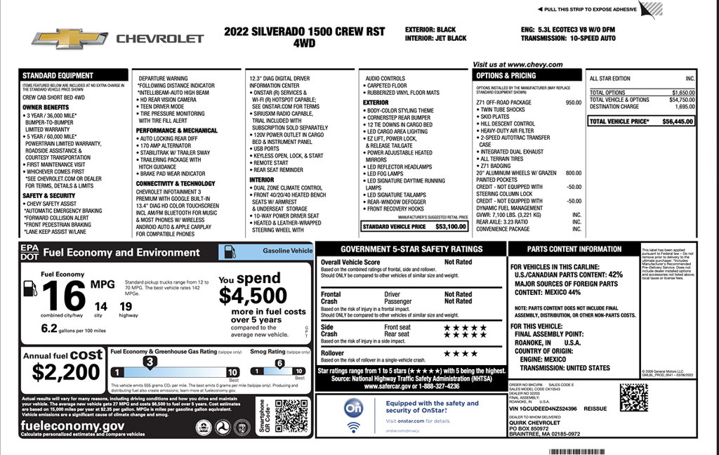 Our 2022 Chevrolet Silverado 1500 RST Crew Cab 4X4 with the Z71 Off-Road Package works strong on the job and looks great on the street in Black! Powered by a 5.3 Liter EcoTec3 V8 that serves up 355hp connected to a 10 Speed Automatic transmission. You can use that strength for impressive towing and hauling capability, and this Four Wheel Drive truck also sees nearly 20mpg on the highway with an automatic locking differential for enhanced traction almost anywhere. Get ready to get noticed since our Silverado shows off the Z71 Off-Road & Protection Package, twin-tube shocks, hill descent control, skid plates, 2 Speed AutoTrac transfer case, dual exhaust, spray-on Bedliner, step bars, Z71 badging, LED lighting, fog lamps, black recovery hooks, a matching front Bowtie, high-gloss black mirror caps, and alloy wheels.