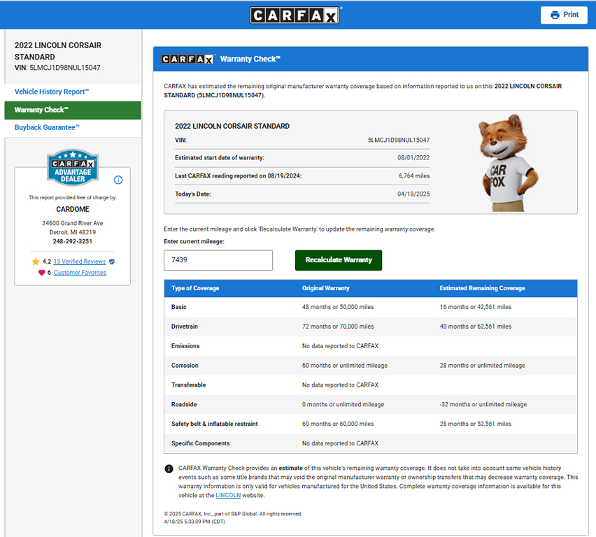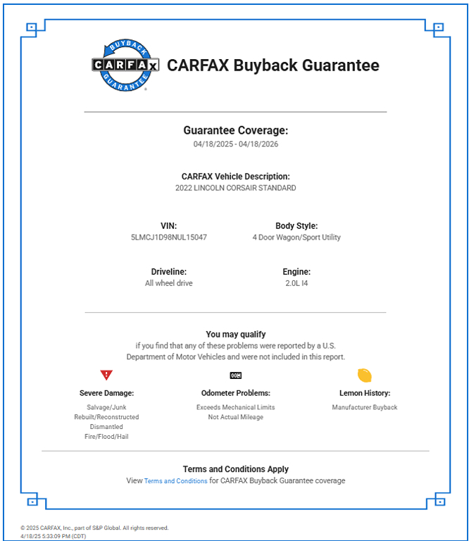 Lincoln helps keep you out of harm's way with a backup camera, a blind-spot monitor, lane-keeping assistance, automatic braking, forward collision warning, and more. Loving our Lincoln Corsair Standard is easy with advantages like those. Save this Page and Call for Availability. We Know You Will Enjoy Your CarDome Auto Sales Test Drive Towards Ownership!