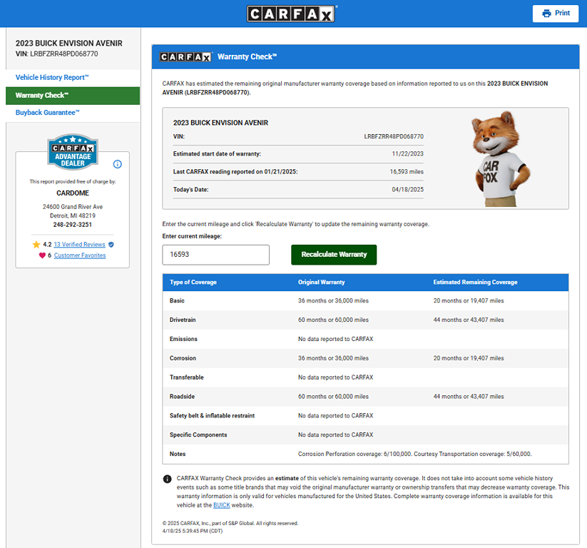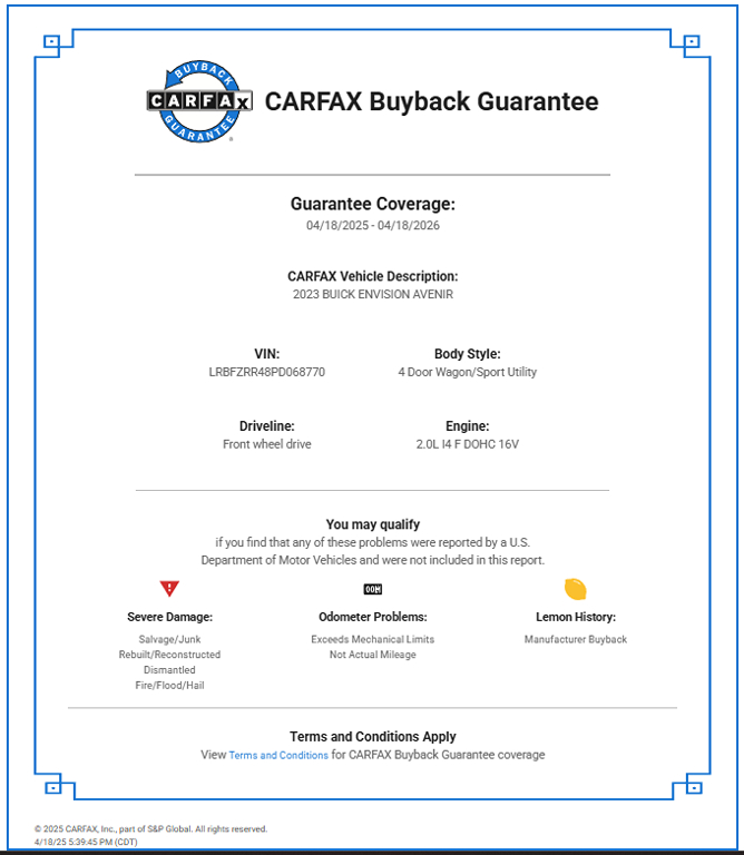 Buick takes an intelligent approach to your safety with a head-up display, HD Surround Vision, a digital rearview mirror, enhanced automatic braking, lane-keeping assistance, blind-spot monitoring, and more. All that and stylish strength come together in our Envision Avenir! Save this Page and Call for Availability. We Know You Will Enjoy Your CarDome Auto Sales Test Drive Towards Ownership!