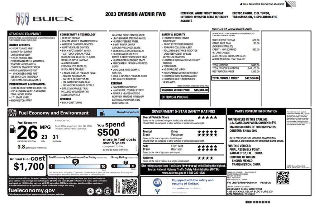 Sophisticated and expressive, our 2023 Buick Envision Avenir brings you bold benefits for better adventures in White Frost Tricoat! Motivated by a TurboCharged 2.0 Liter EcoTec 4 Cylinder that serves up 228hp matched to a 9 Speed Automatic transmission for quick and quiet acceleration. Continuous damping control helps you move with tremendous confidence, and our Front Wheel Drive SUV also scores nearly 31mpg on the highway. Our Envision's detailed design cues draw attention with enhanced LED lighting, 20-inch alloy wheels, a panoramic sunroof, heated power-folding mirrors, silver roof rails, and a hands-free liftgate.
