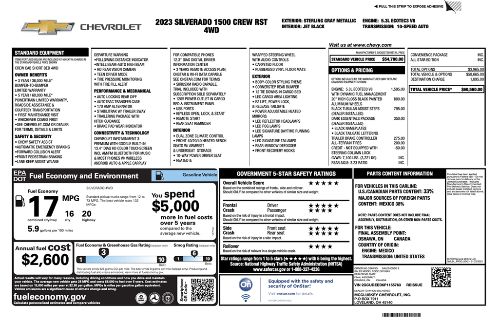 This 2023 Chevrolet Silverado 1500 RST 4WD Crew Cab offers a strong combination of performance, capability, and modern styling, finished in Sterling Gray Metallic over a Jet Black interior. With its bold RST appearance and powerful V8, this truck is perfect for both work and everyday driving.