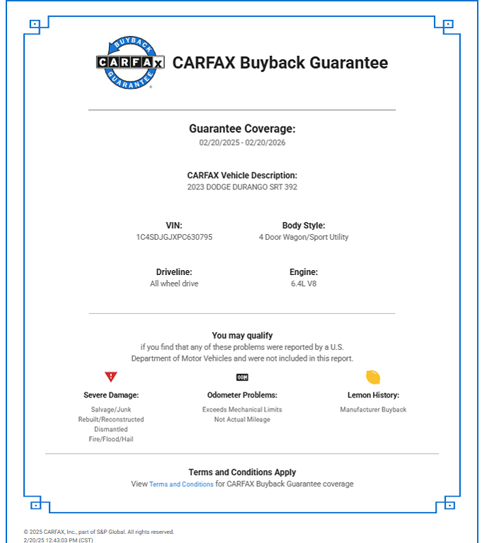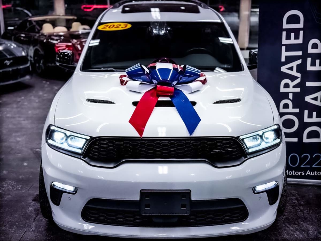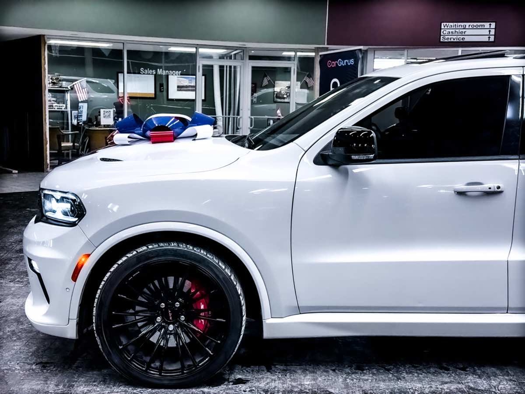 Fast and luxurious, our 2023 Dodge Durango SRT 392 Premium AWD redefines family driving in White Knuckle! Powered by a 6.4 Liter HEMI V8 supplying 475hp to a paddle-shifted 8 Speed Automatic transmission for sprinting to 60mph in just 4.4 seconds. This All Wheel Drive SUV also comes with Brembo brakes, SRT drive modes, a Bilstein active damping suspension, and performance steering, and it achieves nearly 19mpg on the highway. Aggressive Durango styling stands out with LED lighting, fog lamps, dual-exhaust outlets, a power liftgate, sunroof, 20-inch Hyper Black wheels, and a performance hood.