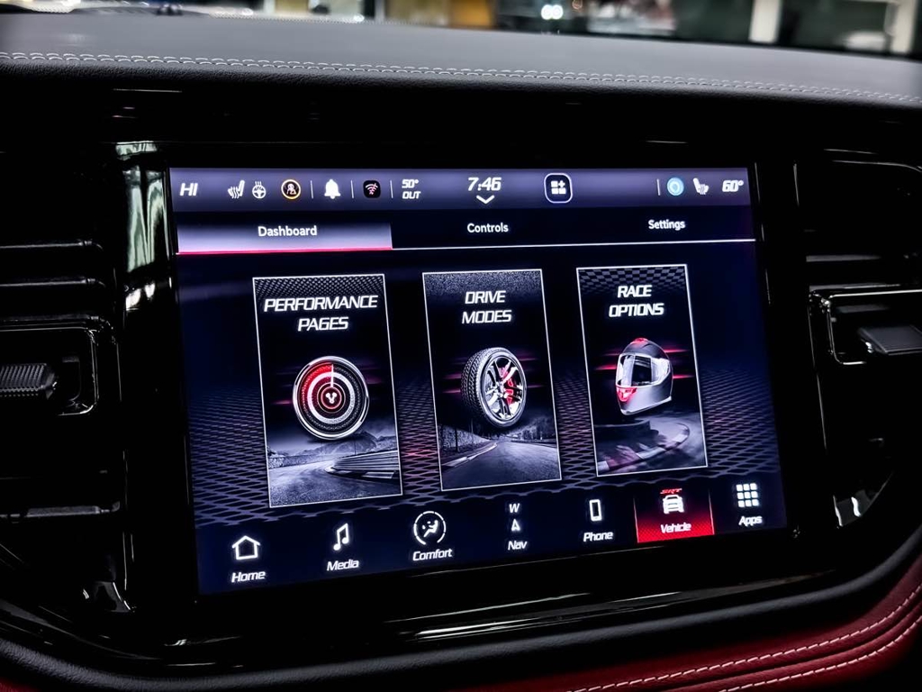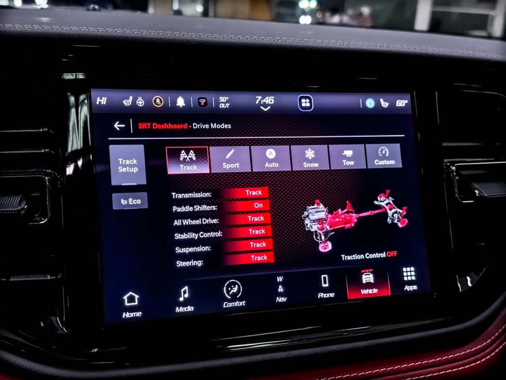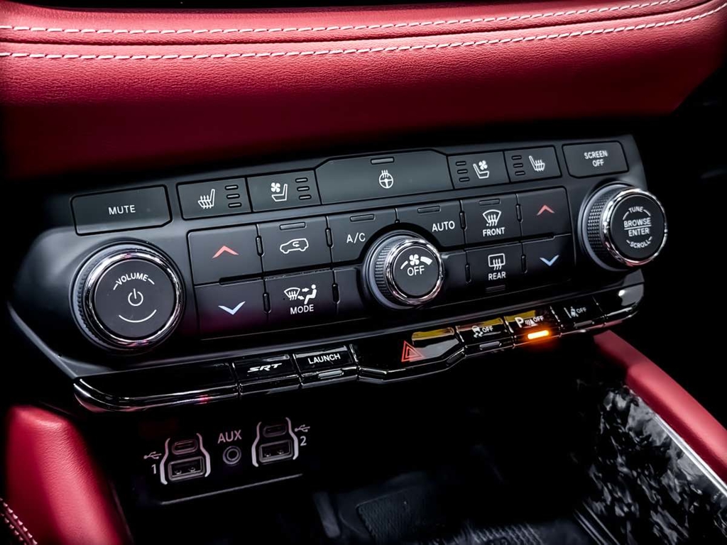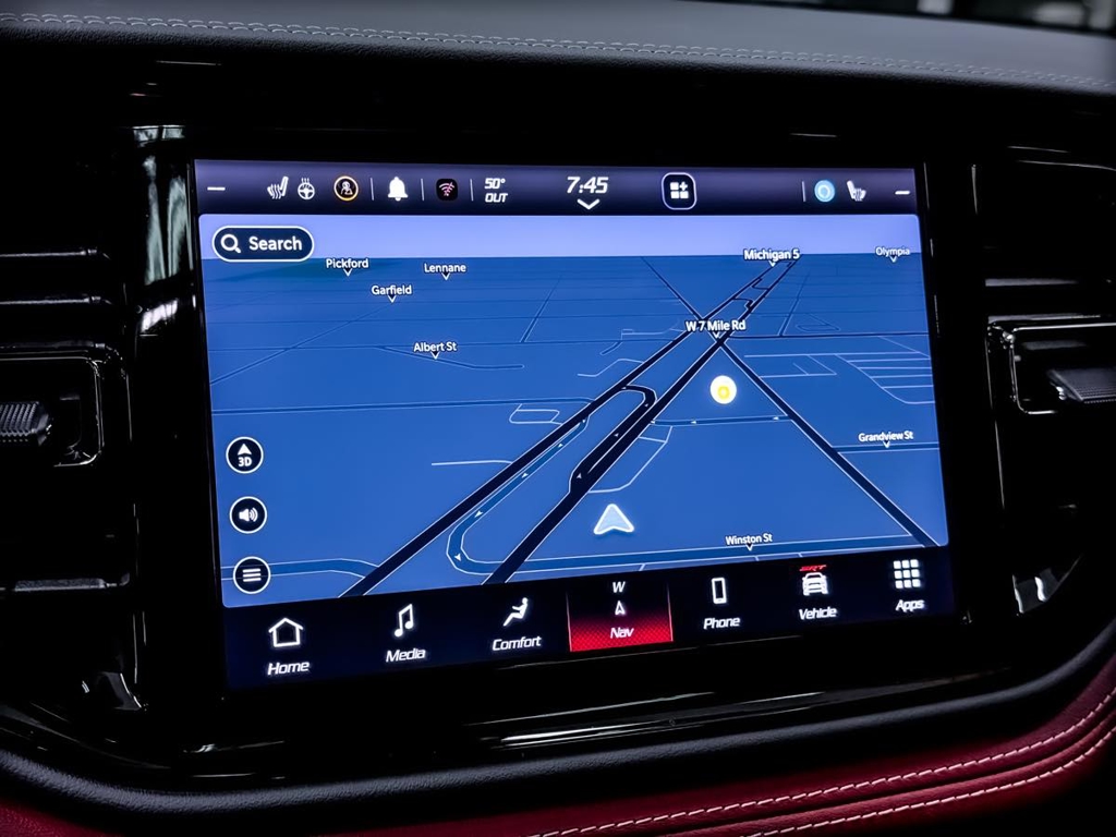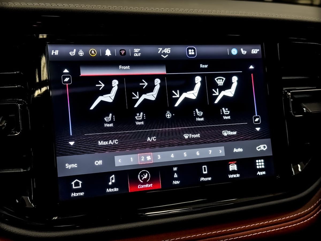 Our impressive SRT 392 Premium cabin rewards you with heated/ventilated Laguna leather power front seats, heated second-row captain's chairs, a flexible third row, a heated leather power steering wheel, tri-zone automatic climate control, carbon-fiber accents, and a hand-wrapped instrument panel. Harman Kardon audio delivers a hi-fi soundtrack to support SRT Performance Pages, a 10.1-inch touchscreen, full-color navigation, WiFi compatibility, Android Auto/Apple CarPlay, Bluetooth, voice command, and wireless charging.
