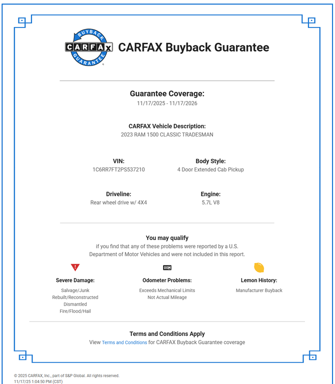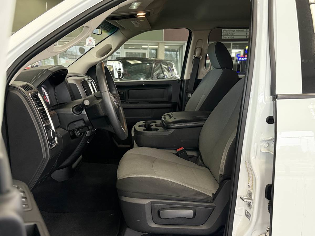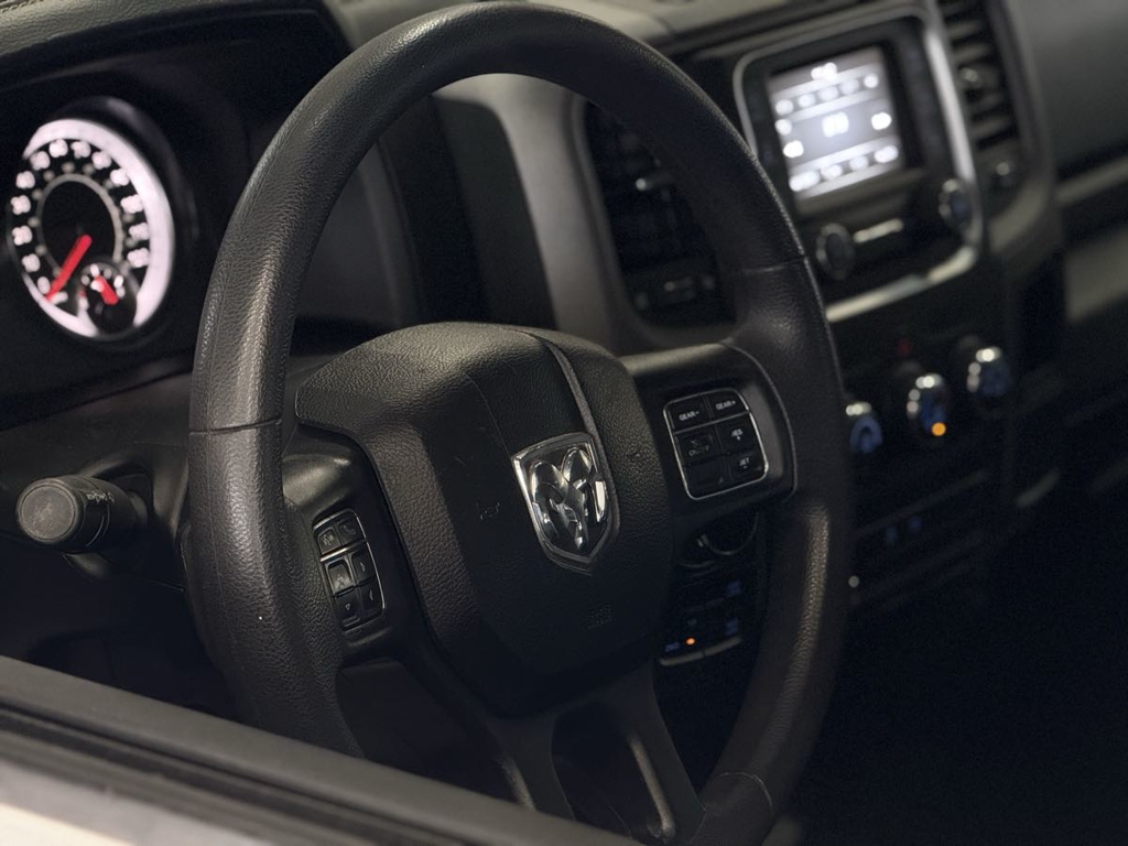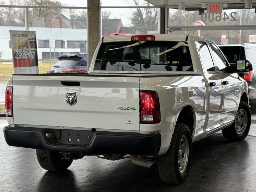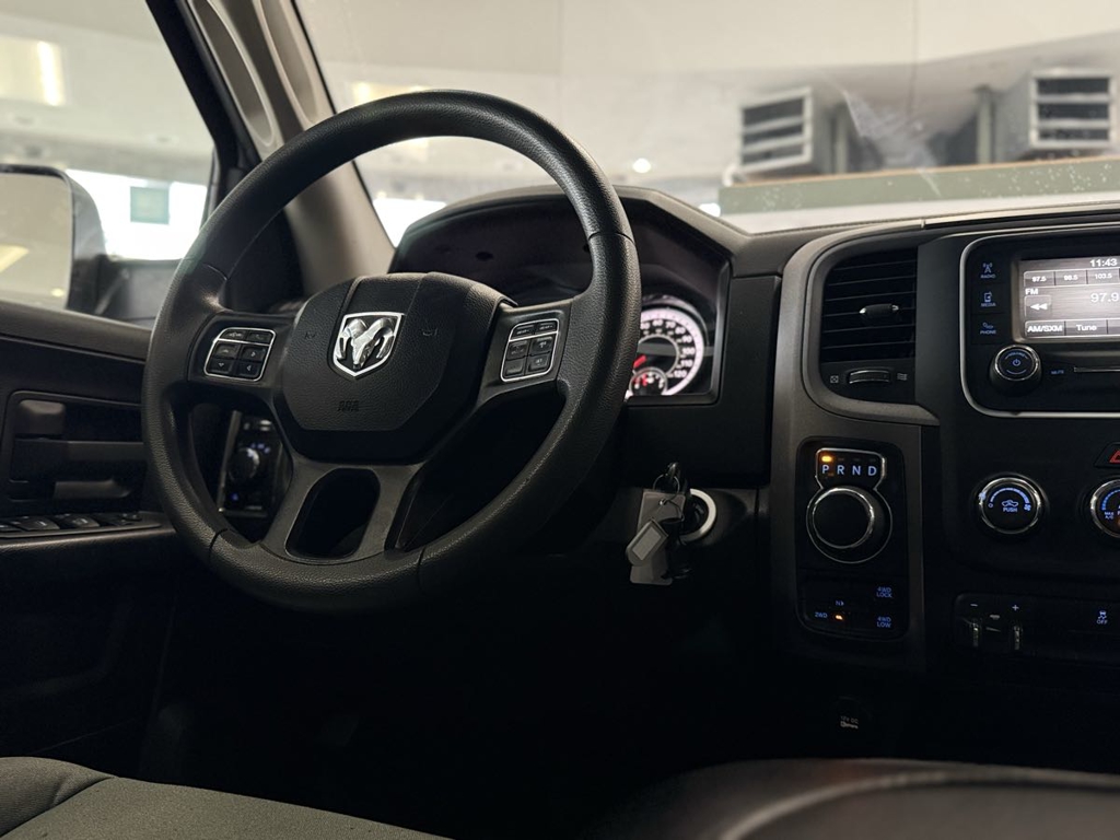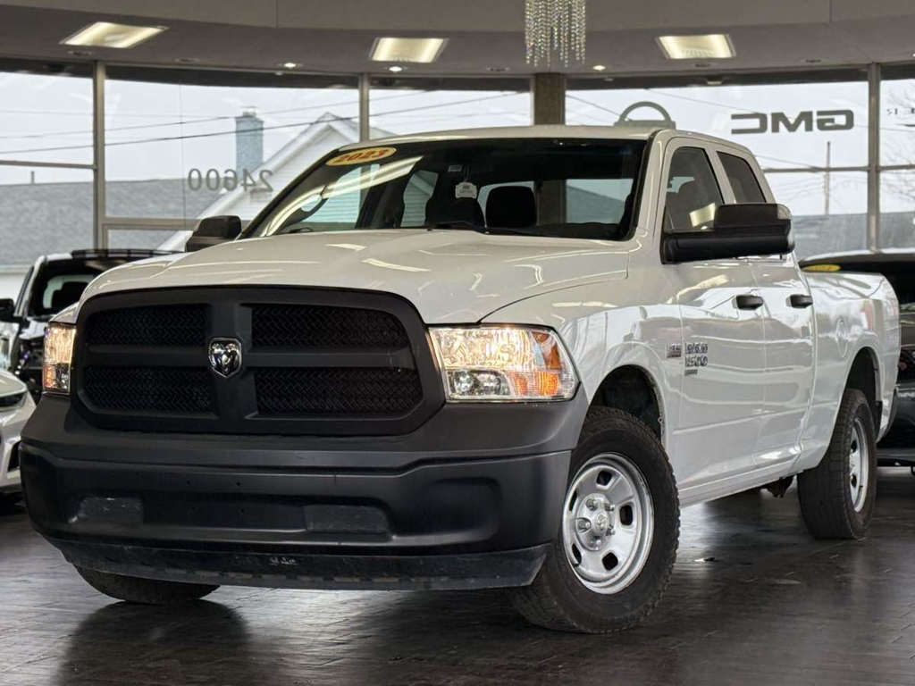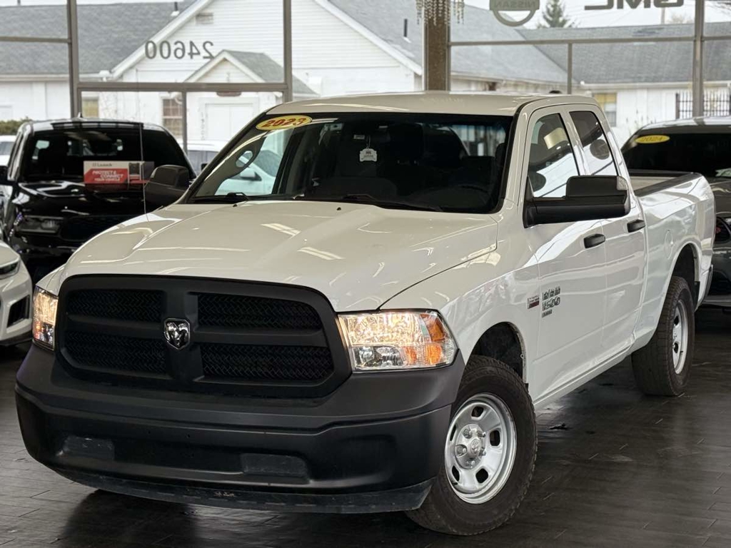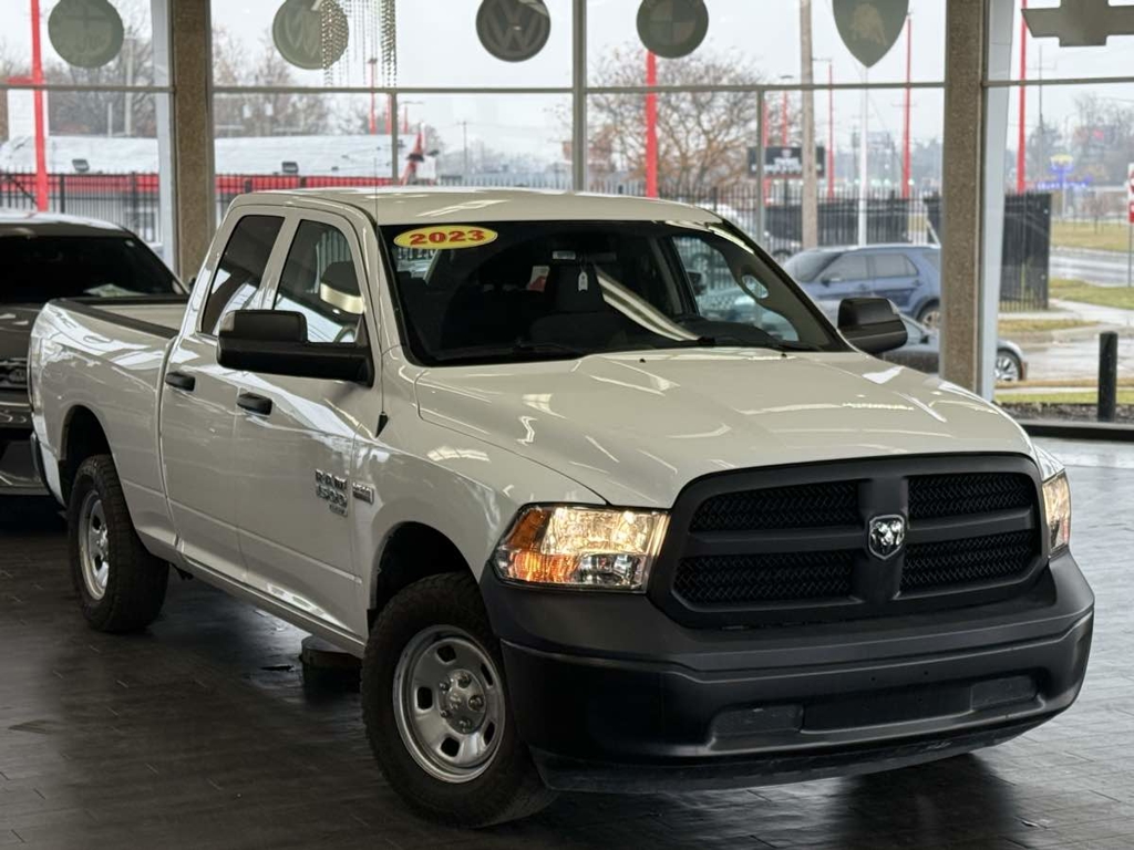 The 2023 Ram 1500 Classic Tradesman 4x4 Quad Cab is a robust pickup designed for both power and reliability. Its exterior, finished in a pristine Bright White Clearcoat, offers a blend of timeless style and rugged durability, perfect for tackling any job or adventure. Under the hood, the commanding 5.7L 8-cylinder engine, equipped with HEMI MDS VVT, delivers impressive performance and efficiency, ensuring any drive feels effortless.
