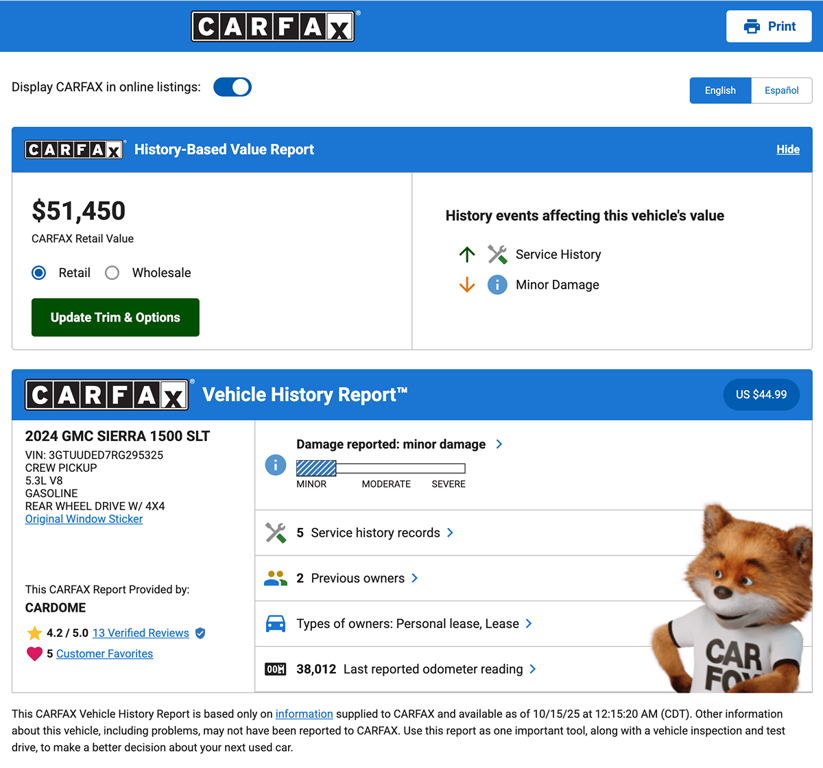 GMC helps you keep out of harm's way with Professional Grade driver assistance from automatic braking, lane departure warning, forward collision warning, a rearview camera, lane-keeping assistance, pedestrian detection, tire pressure monitoring, hill-start assist, and more. Crafted to exceed expectations, our Sierra 1500 SLT is an excellent choice! Save this Page and Call for Availability. We Know You Will Enjoy Your CarDome Auto Sales Test Drive Towards Ownership!