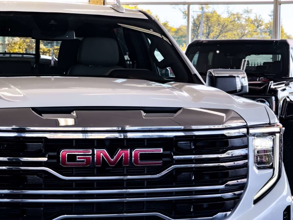 Strong and stylish, our 2024 GMC Sierra 1500 SLT Crew Cab 4X4 is built to break boundaries in White Frost Tricoat! Motivated by a 5.3 Liter V8 supplying 355hp to a 10 Speed Automatic transmission complemented by a locking rear differential for dynamic performance. Our Four Wheel Drive truck relies on that setup for serious capability and scores nearly 20mpg on the highway. Proudly poised for action, our Sierra boasts LED lighting, fog lamps, 18-inch alloy wheels, a MultiPro tailgate, perimeter lighting, bed lighting, chrome bumpers, running boards, and heated power-folding mirrors with chrome caps.
