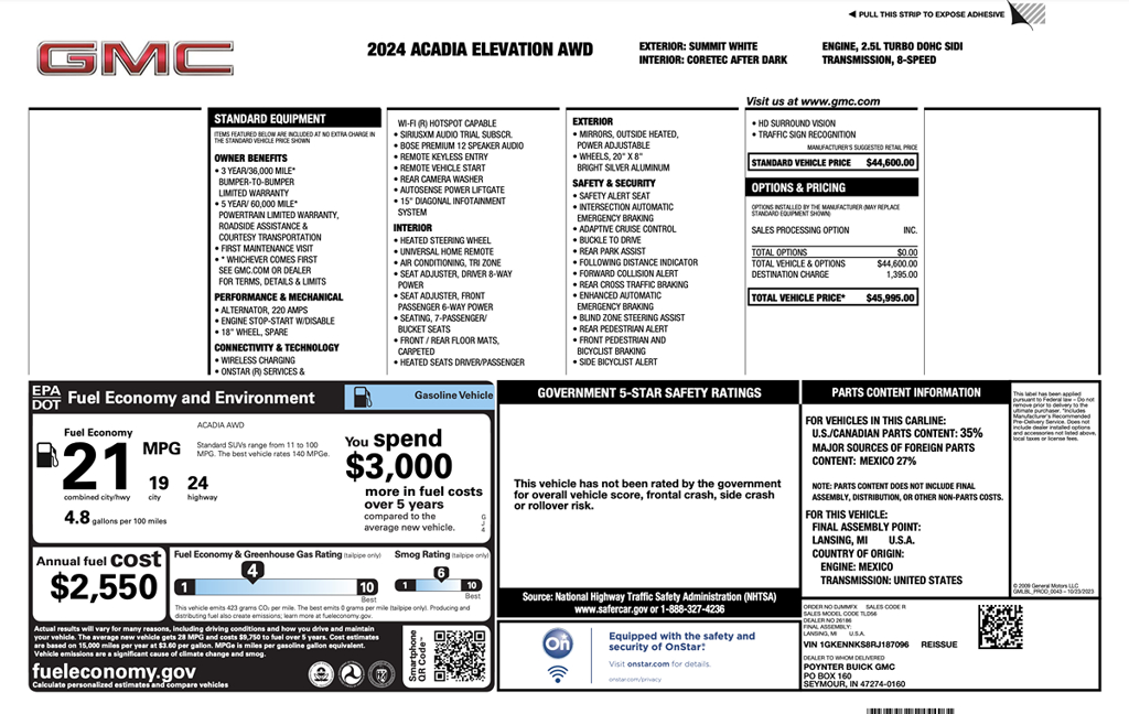 Prepare to be impressed with our 2024 GMC Acadia Elevation AWD that rises above the crowd in Summit White! Powered by a TurboCharged 2.5 Liter 4 Cylinder serving up 328hp to an 8 Speed Automatic transmission with ample strength to tow and go. Responsive handling is another benefit of this bold All Wheel Drive SUV, and it achieves nearly 28mpg on the highway. Ready to command your days, our Acadia comes with LED lighting, 20-inch alloy wheels, a hands-free liftgate, dual bright exhaust tips, roof rails, and heated power mirrors.