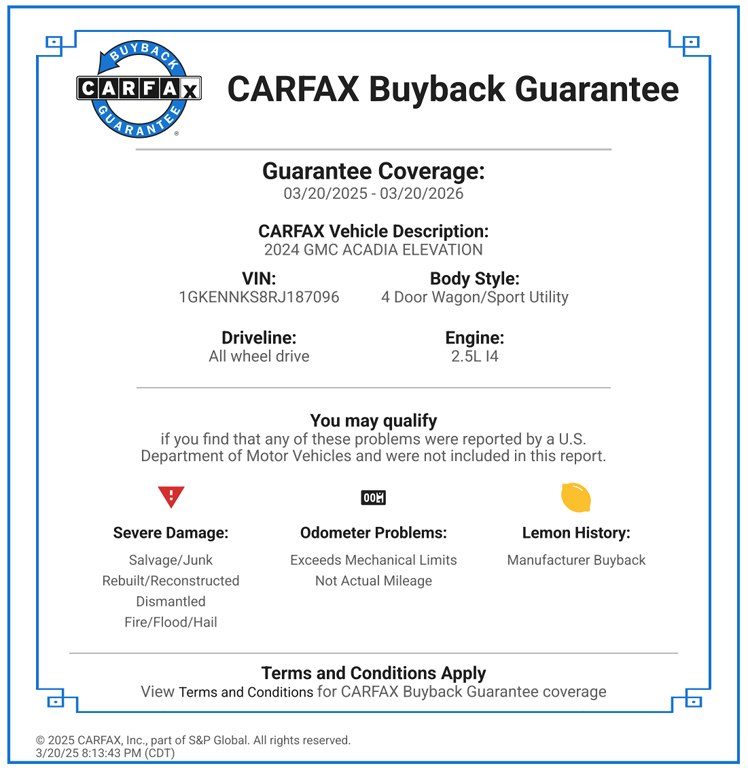 GMC takes your safety seriously, supplying adaptive cruise control, automatic braking, a digital rearview mirror, an HD backup camera, lane-keeping assistance, blind-spot monitoring, rear cross-traffic alert, a rear-seat reminder, and other smart technologies. There's just more to love in our mighty Acadia Elevation. Save this Page and Call for Availability. We Know You Will Enjoy Your CarDome Auto Sales Test Drive Towards Ownership!