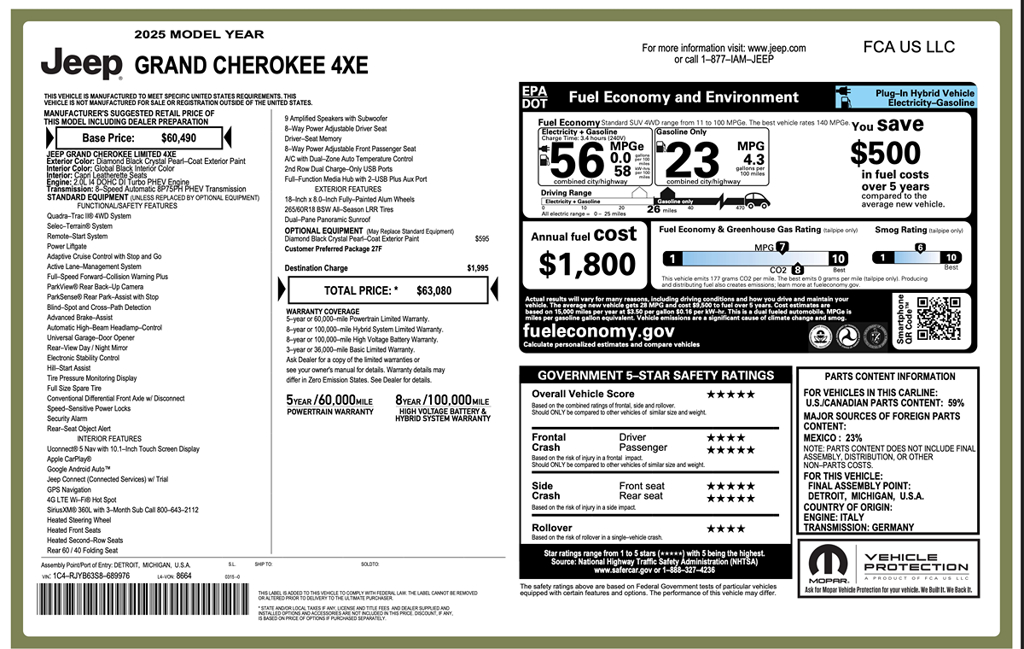 In the 2025 Jeep Grand Cherokee 4xe 4x4, rugged capability meets refined luxury, making every drive a spectacular experience. This model is completed in the stunning Diamond Black Crystal Pearlcoat, offering a sophisticated and commanding presence on the road. Its design flawlessly pairs with the upscale Global Black Capri leatherette seats, providing a chic and comfortable interior for those long adventures or daily commutes.