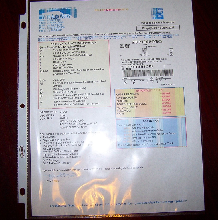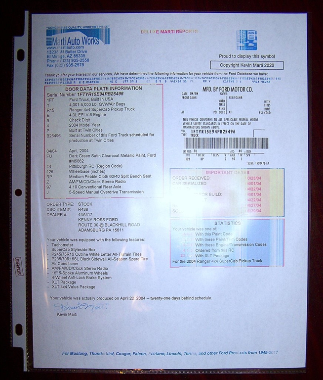 If you're not viewing this vehicle on our website. Please view the 105 plus photos on our website at cherokeeautogroup.com Click inventory & type in search 2004 RANGER in search tab! Check out another super neat Cherokee Auto Group needle in a hay stack find! This is a super neat 1-Owner truck with a great history & only 73k Actual Miles & only one of 1138 built per the Marti Report with this trim pkg! It's worth the short read...we want potential buyer to understand what this rig is all about on this special truck! This Ranger was special ordered new on 03-23-2004 and manufactured on 04-22-2004 & Mr Perorney took delivery on 6-29-2004. We recentley acquired this Ranger and could not believe we found it! Well now let's go over more details in this great spec 1-Owner 2004 Ford Ranger XLT with rare SST pkg Super Cab Short Bed 4.0L V6 4WD & ultra rare 5-speed manual transmission. They do not make them like this simple easy design. It has lots of nice features like XLT & SST Pkg, SOHC 4.0L V6, 5-speed manual transmission with dash shift 4wd, 60-40 Bucket seats with flip down arm rest & small floor console, Axel code 97 4.10 rear axle ratio, a/c, power steering, power brakes, nice tinted windows, vent shades, front tow hooks, no power windows, no power door locks, argent grey color key trim & chrome bumpers, no tow receiver hitch & looks to have never towed anything or ball added to factory bumper, nice Ford bedliner, nice clear headlamps, nice XLT SST trim pkg, nice original looking condtion thru-out & much more! This is a sharp stock truck and is ready to enjoy and drive, Nice 15 inch black alloy wheels with chrome caps & chrome lugs with older RWL 31-10-50-15 inch all terrain tires, factory am/fm Stereo CD, 2 sets of keys, all books and manuals, spare tire & jacks and tools are in place and more! This truck runs and drives super smooth tight & nice, stock exhaust, stock air box & no modifications! Paint looks clean and shows well. nice interior with factory tu-tone seats and clean dash & rubber flooring, nice engine bay, nice undercarriage. There is no telling how dependable and long lasting this well kept Ranger will last. Do you think it will out last a new 2025? Up to you so weigh your options! I doubt there's another out there like it! Over 2k on recent service that inc all new shocks, new battery, oil & filter change, transmission fluid change, new fuel pump & more! It also just passed Georgias strict emissions! Ranger is parked in our showroom it is that decent. Please call ahead for avalability.