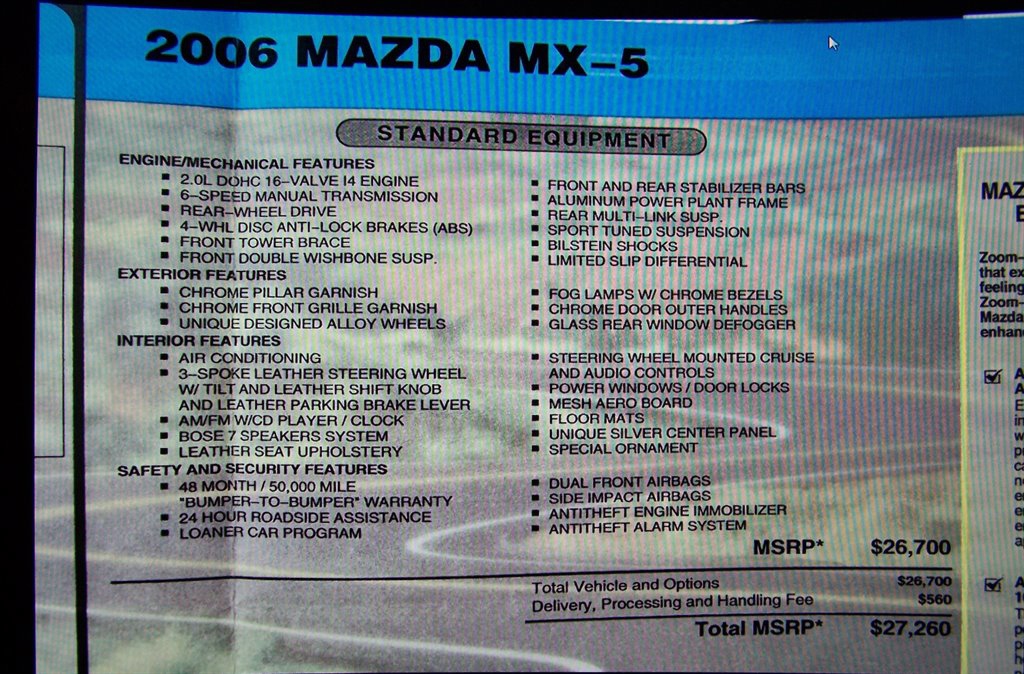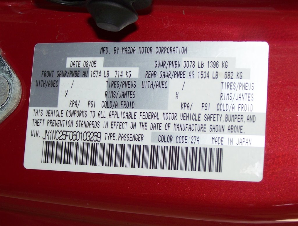 If your not viewing this vehice on our website. Please view the 85 plus photos on our website at cherokeeautogroup.com Type in search 2006 MIATA in search tab! Nice sharp well equipped 1-Owner 62k mile adult owned stock & un-modified, This a quite special car it is only 1 of 750 built & #1315 for US Market Mazda did 3500 worldwide to celibrate the 3rd generation of the Miatat! It's the Grand Touing Mazda Miata MX-5 Limited 2.0L RWD 6-Speed! This is one neat car and is a rock solid car and is a blast to drive! This one only has 62k org miles and has the look! Quite nice Limited Edtion Velocity Red Mica Metallic Color body with original black cloth top with glass rear window, nice heated black leather seats! Paint shines well & clearcoat shows nice! Smooth strong 2.0L DOHC 4cyl with tight 6 speed manual and rear wheel drive & no timing belt it is a factory timing chain. It has Limited pkg with factory fog lamps, power windows, key less entry with power door locks, power mirrors, limited-slip differential, Limited Edtion only 17"³ V-spoke Graphite alloy wheels, Bilstein shocks, fog lights, cruise control, and cold air conditioning, Bose am/fm/cd-cass, factory floor mats, leather wrapped steering wheel, guage pkg, 4 wheel power disc brakes, power steering and much more! This one is parked in our showroom it is that nice please call ahead to set up a time to check it out!