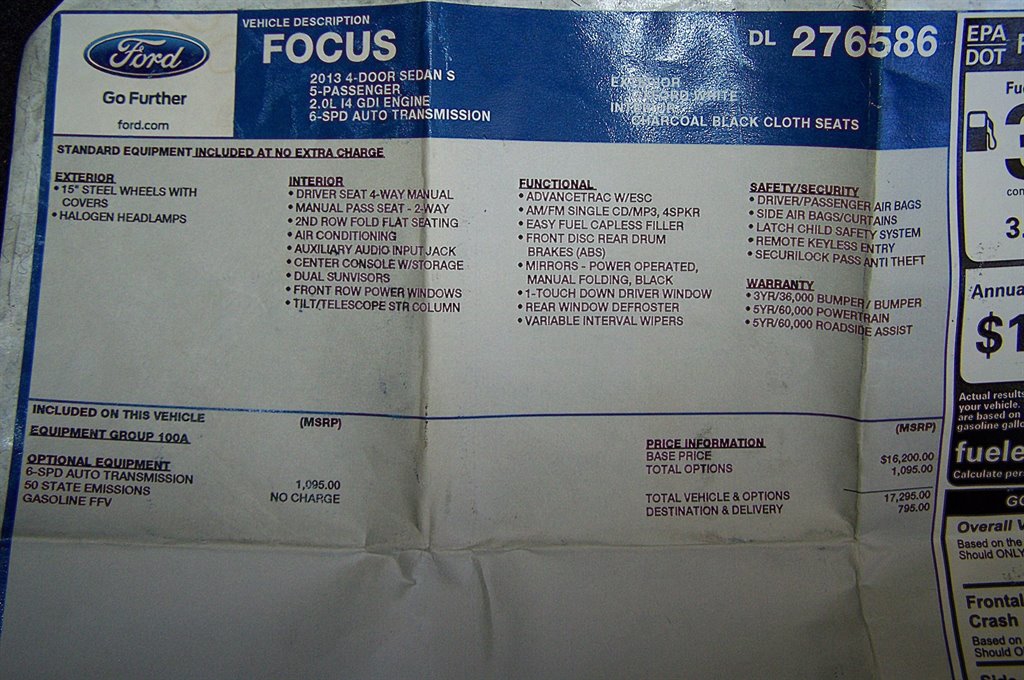 If your not viewing this vehicle on our website. Please view the 75 plus photos on our website at cherokeeautogroup.com Type in search 2013 FOCUS in search tab! Just in is this clean value priced 1-owner Premium Pkg S with only 63k original mile sedan! This sharp vehicle is loaded and is one smooth machine. Check out the equipment list it has the 2.0L fuel injected 4cyl, 6 speed automatic, systems monitor, muilty adjust drivers seat & console, Keyless entry system with power windows & power door locks, nice fresh clean interior with premium cloth seats, Nice Graphite factory wheel covers with match set of 16 inch tires, good looking paint and body, color keyed bumpers & trim, tinted glass, nice headlights, intererior accent pkg, floor mats & dash cover, Microsoft SYNC am/fm/cd with aux imput usb, all books and manuals & original windowsticker, steering wheel controls, power windows, power door locks and much more! Just passed Georgias strict emissions. This one runs and drives out smooth as you would expect and new owner should really like this one!