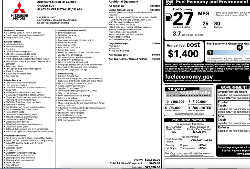If your not viewing this vehicle on our website. Please view the 100 plus photos on our website at cherokeeautogroup.com Type in search MITSUBISHI in search tab! Check out this neat 2019 Mitsubishi Outlander LE Limited Edition Sport Premium pkg 2WD multi purpose utility wagon with rare factory rear 3rd seat & only 82k! These are a quite desirable gen of the Outlander & were direct competitors to the Toyota Rav-4's & Honda CRV's! If this was a similar equipped RAV or CRV you would expect to pay almost double the price of this one! These are super neat very versatile units and this is the right one with its fuel inj SOHC 2.4L 4cyl & Automatic. Most likely if your looking at this little fella you know what they are! They have a great following! Lets touch on a few features some are unique to this rig & also see photo of window sticker! Nice brightwork, paint & body with minor dings & chips but still shows quite presentable as you can see. Nice tidy heated suede leather seats with dual power drivers & passenger seat. This one is loaded with wide open rear hatch access to load & unload, rare rear 3rd seat, cold digital climate control dual zone a/c & hot heat, 7 inch touch screen am/fm Bluetooth & back up camera, fog lamps, power glass moonroof, roof rack rails, power windows, power door locks, power steering, tilt/cruise, all books and manuals & copy of window sticker, push to start keyless entry with remote, nice factory 18 inch black Limited Edition pkg alloy wheels & match set of radials, Nice engine bay. Good looking undercarrage. Its nice thru-out & looks like a neat one. Just passed Georgias strict emission so you are good to go there. This one runs & drives out smooth and strong! The new owner should really like this low mile, clean quite decent unit! Please call ahead to set up a time to check it out!