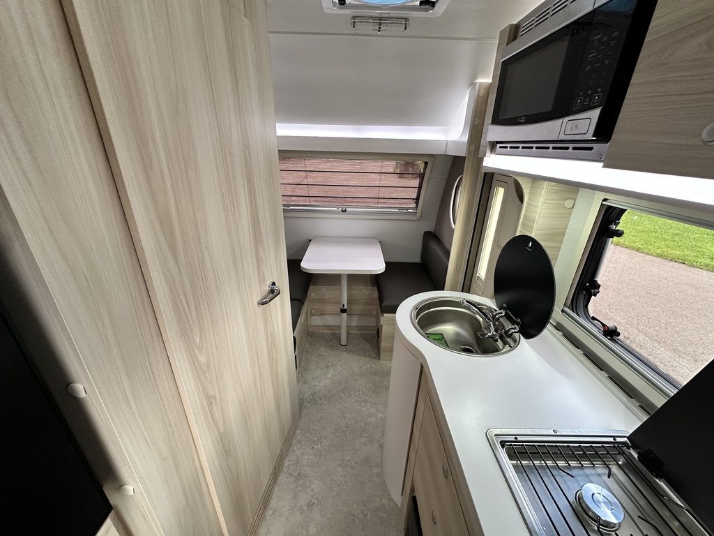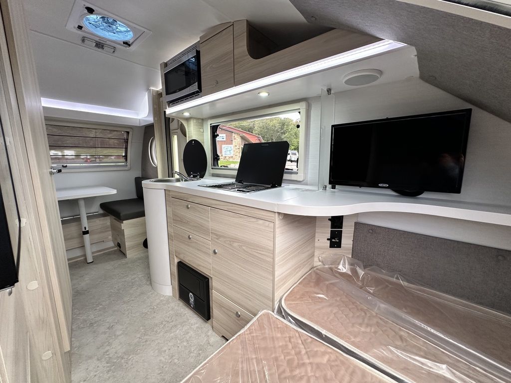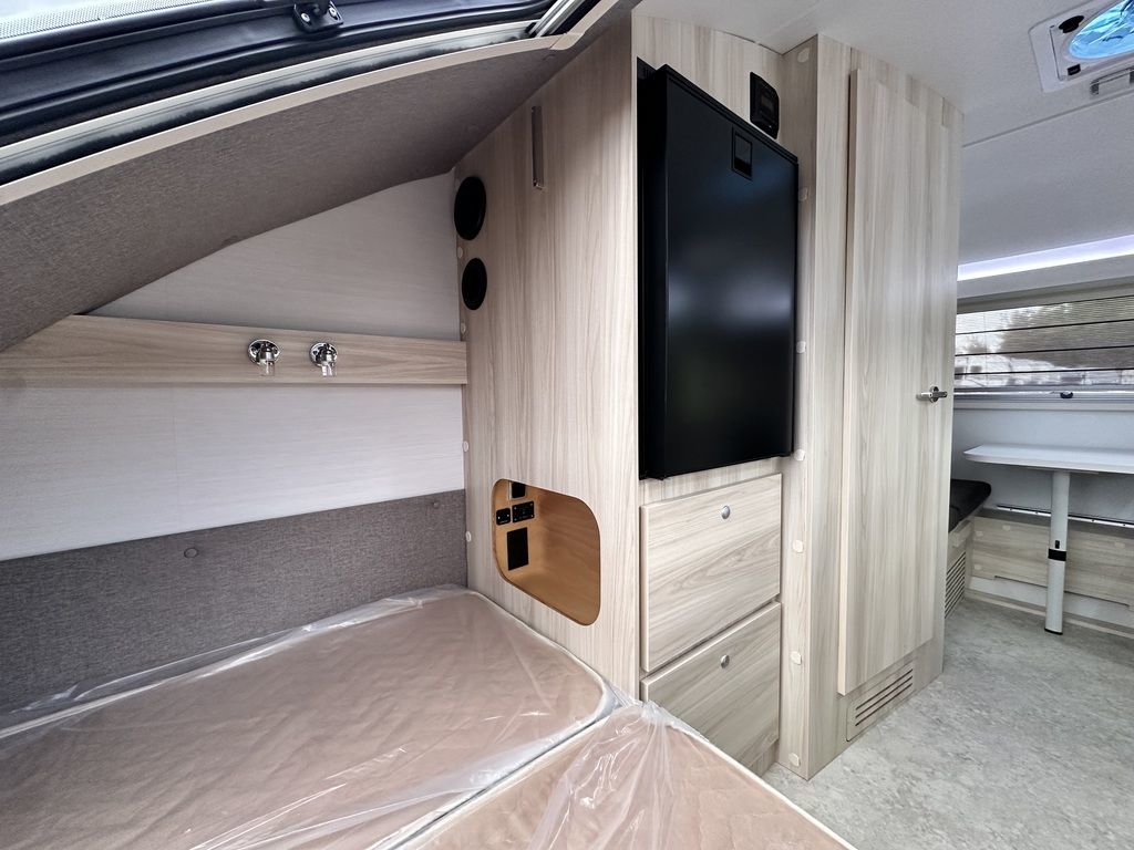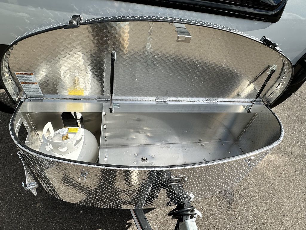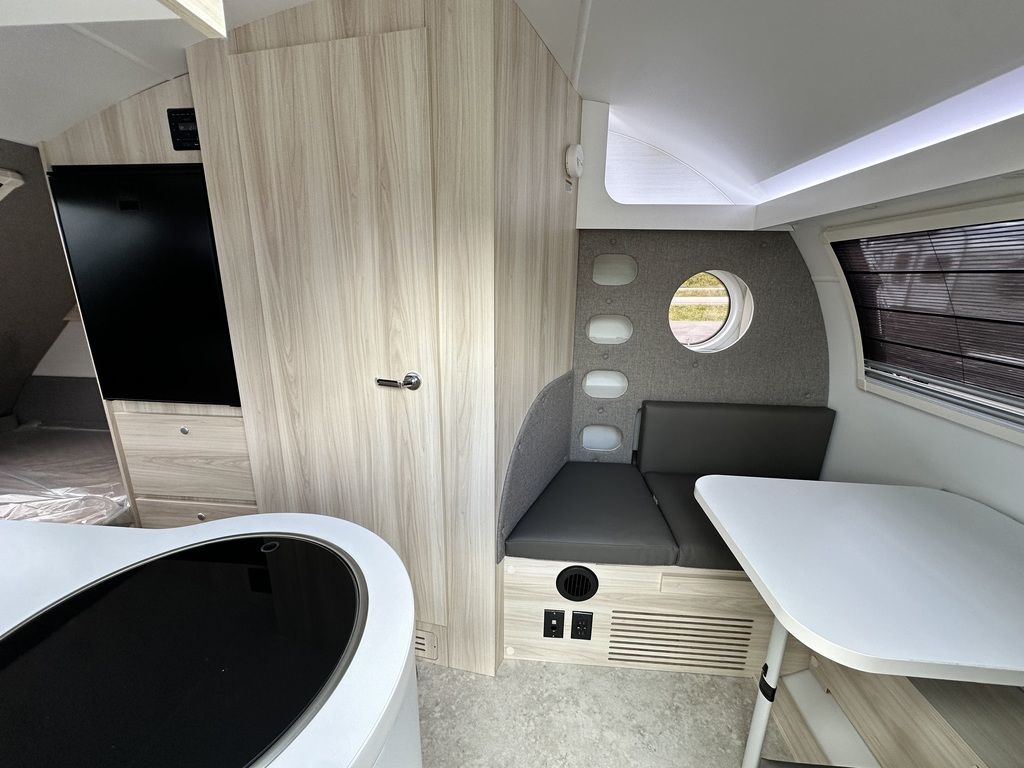 The TAB 400 is the ideal choice if you're drawn to the unique shape of teardrop trailers but require extra space. This versatile trailer offers a comfortable dinette, a dedicated queen-size bed, a spacious wet bath, a galley kitchen, and ample storage. One thing that sets it apart is the option to have a hidden bunk, easily accessible when needed and cleverly concealed when not in use. This makes the TAB 400 perfect for small families or grandparents who enjoy occasional camping trips with their grandchildren. With its comprehensive features, the TAB 400 truly becomes your home on wheels.