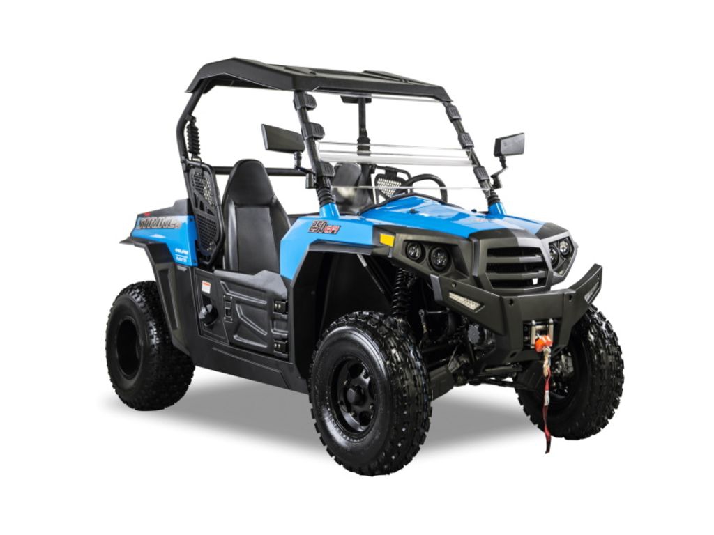The Strike 250 is the ultimate sport side-by-side giving youth riders their first chance to drive. With built in parental safety features, the Strike 250 is powered by a 4-stroke single cylinder OHC engine with an automatic CVT transmission and independent dual a-arm suspension. Outfitted with accessories the Strike 250 comes standard with a roof, windshield, doors and a 2,500 lb synthetic rope winch.