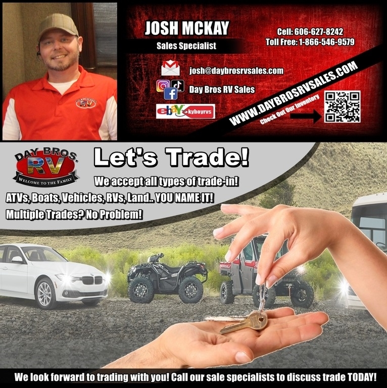Please contact us to confirm the inventory you are interested in is still available for sale and on the premises. At any time a unit could sell (on our lot, over the phone with a holding deposit, or be at another location for an event or sale) before being updated online. If you do not confirm availability/location before hand (including before heading to our dealerships) we can not guarantee availability. All sale prices include all other incentives, offers, and rebates offered by Day Bros RV Sales or any other manufacturer unless specified in writing. All Day Bros RV Stores prices, sales, and offers are subject to change without notice and All Day Bros RV Stores reserve the right to price any unit, including those spotlighted or specially marked, before, during or after a sale or promotion of any kind or type of advertisement including that of an email blast, TV spot, written ad or any other type of advertisement at any price they wish after any sale or promotion ends to ultimately sell every unit. *(w.a.c.) Estimated payment figured at 5.99% on 20 yrs with 10% down on units above $49,001. Units below $49,000, estimated payment figured at 5.99% on 15yrs with 10% down. Price and payment do NOT include TT&L or any other fees that may apply. Used units and RVs under $50K are subject to shorter terms, higher rates, and restrictions. This information is also subject to change. Call DBRV Location's finance department for complete details. Some videos and photos may not represent the actual vehicle for sale. Manufacturer's standards and features subject to change without notice. ALL weights, measurements, sizes, etc. including, but not limited to, TVs, bed sizes, tank capacities, lengths, GVWRs, etc., are all either estimated or information provided by the manufacturer and not guaranteed to be 100% accurate by DBRV or the manufacturer due to continual product changes and enhancements. All deposits are NON-REFUNDABLE unless otherwise specified in writing. Upon receipt of deposit seller (DBRV) agrees to hold the selected unit and prepare it for delivery and orientation to the buyer. Buyer understands and agrees that by leaving said NON-REFUNDABLE deposit they are asking DBRV to prepare their purchase for delivery and orientation and should they fail to pay for their purchase by the specified delivery date they will forfeit the NON-REFUNDABLE deposit. DBRV retains the right to apply partial or all said NON-REFUNDABLE deposit to a future purchase. Online info deemed reliable, but not guaranteed. All materials are copyrighted by All Day Bros RV Stores. All rights are reserved. No part of any material on our websites may be reproduced, distributed, or transmitted in any form or by any means without the prior written permission of Day Brother's Auto/RV Sales LLC Management Team. Thank you so much for shopping with us at our Day Bros RV Stores. If you have any further questions about sale prices, promotions, finance, availability, etc. please contact the Corporate Store in London, KY or 1-866-546-9579. Thank You.