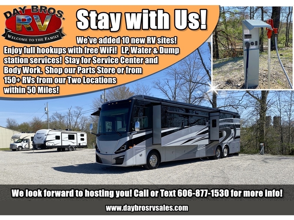 Please contact us to confirm the inventory you are interested in is still available for sale and on the premises. At any time a unit could sell (on our lot, over the phone with a holding deposit, or be at another location for an event or sale) before being updated online. If you do not confirm availability/location before hand (including before heading to our dealerships) we can not guarantee availability. All sale prices include all other incentives, offers, and rebates offered by Day Bros RV Sales or any other manufacturer unless specified in writing. All Day Bros RV Stores prices, sales, and offers are subject to change without notice and All Day Bros RV Stores reserve the right to price any unit, including those spotlighted or specially marked, before, during or after a sale or promotion of any kind or type of advertisement including that of an email blast, TV spot, written ad or any other type of advertisement at any price they wish after any sale or promotion ends to ultimately sell every unit. *(w.a.c.) Estimated payment figured at 5.99% on 20 yrs with 10% down on units above $49,001. Units below $49,000, estimated payment figured at 5.99% on 15yrs with 10% down. Price and payment do NOT include TT&L or any other fees that may apply. Used units and RVs under $50K are subject to shorter terms, higher rates, and restrictions. This information is also subject to change. Call DBRV Location's finance department for complete details. Some videos and photos may not represent the actual vehicle for sale. Manufacturer's standards and features subject to change without notice. ALL weights, measurements, sizes, etc. including, but not limited to, TVs, bed sizes, tank capacities, lengths, GVWRs, etc., are all either estimated or information provided by the manufacturer and not guaranteed to be 100% accurate by DBRV or the manufacturer due to continual product changes and enhancements. All deposits are NON-REFUNDABLE unless otherwise specified in writing. Upon receipt of deposit seller (DBRV) agrees to hold the selected unit and prepare it for delivery and orientation to the buyer. Buyer understands and agrees that by leaving said NON-REFUNDABLE deposit they are asking DBRV to prepare their purchase for delivery and orientation and should they fail to pay for their purchase by the specified delivery date they will forfeit the NON-REFUNDABLE deposit. DBRV retains the right to apply partial or all said NON-REFUNDABLE deposit to a future purchase. Online info deemed reliable, but not guaranteed. All materials are copyrighted by All Day Bros RV Stores. All rights are reserved. No part of any material on our websites may be reproduced, distributed, or transmitted in any form or by any means without the prior written permission of Day Brother's Auto/RV Sales LLC Management Team. Thank you so much for shopping with us at our Day Bros RV Stores. If you have any further questions about sale prices, promotions, finance, availability, etc. please contact the Corporate Store in London, KY or 1-866-546-9579. Thank You.