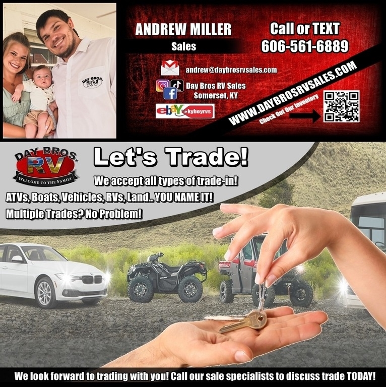 Please contact us to confirm the inventory you are interested in is still available for sale and on the premises. At any time a unit could sell (on our lot, over the phone with a holding deposit, or be at another location for an event or sale) before being updated online. If you do not confirm availability/location before hand (including before heading to our dealerships) we can not guarantee availability. All sale prices include all other incentives, offers, and rebates offered by Day Bros RV Sales or any other manufacturer unless specified in writing. All Day Bros RV Stores prices, sales, and offers are subject to change without notice and All Day Bros RV Stores reserve the right to price any unit, including those spotlighted or specially marked, before, during or after a sale or promotion of any kind or type of advertisement including that of an email blast, TV spot, written ad or any other type of advertisement at any price they wish after any sale or promotion ends to ultimately sell every unit. *(w.a.c.) Estimated payment figured at 5.99% on 20 yrs with 10% down on units above $49,001. Units below $49,000, estimated payment figured at 5.99% on 15yrs with 10% down. Price and payment do NOT include TT&L or any other fees that may apply. Used units and RVs under $50K are subject to shorter terms, higher rates, and restrictions. This information is also subject to change. Call DBRV Location's finance department for complete details. Some videos and photos may not represent the actual vehicle for sale. Manufacturer's standards and features subject to change without notice. ALL weights, measurements, sizes, etc. including, but not limited to, TVs, bed sizes, tank capacities, lengths, GVWRs, etc., are all either estimated or information provided by the manufacturer and not guaranteed to be 100% accurate by DBRV or the manufacturer due to continual product changes and enhancements. All deposits are NON-REFUNDABLE unless otherwise specified in writing. Upon receipt of deposit seller (DBRV) agrees to hold the selected unit and prepare it for delivery and orientation to the buyer. Buyer understands and agrees that by leaving said NON-REFUNDABLE deposit they are asking DBRV to prepare their purchase for delivery and orientation and should they fail to pay for their purchase by the specified delivery date they will forfeit the NON-REFUNDABLE deposit. DBRV retains the right to apply partial or all said NON-REFUNDABLE deposit to a future purchase. Online info deemed reliable, but not guaranteed. All materials are copyrighted by All Day Bros RV Stores. All rights are reserved. No part of any material on our websites may be reproduced, distributed, or transmitted in any form or by any means without the prior written permission of Day Brother's Auto/RV Sales LLC Management Team. Thank you so much for shopping with us at our Day Bros RV Stores. If you have any further questions about sale prices, promotions, finance, availability, etc. please contact the Corporate Store in London, KY or 1-866-546-9579. Thank You.