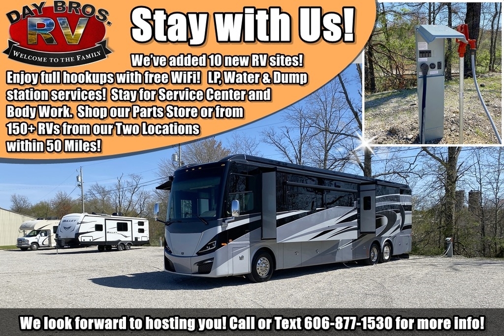 Please contact us to confirm the inventory you are interested in is still available for sale and on the premises. At any time a unit could sell (on our lot, over the phone with a holding deposit, or be at another location for an event or sale) before being updated online. If you do not confirm availability/location before hand (including before heading to our dealerships) we can not guarantee availability. All sale prices include all other incentives, offers, and rebates offered by Day Bros RV Sales or any other manufacturer unless specified in writing. All Day Bros RV Stores prices, sales, and offers are subject to change without notice and All Day Bros RV Stores reserve the right to price any unit, including those spotlighted or specially marked, before, during or after a sale or promotion of any kind or type of advertisement including that of an email blast, TV spot, written ad or any other type of advertisement at any price they wish after any sale or promotion ends to ultimately sell every unit. *(w.a.c.) Estimated payment figured at 5.99% on 20 yrs with 10% down on units above $49,001. Units below $49,000, estimated payment figured at 5.99% on 15yrs with 10% down. Price and payment do NOT include TT&L or any other fees that may apply. Used units and RVs under $50K are subject to shorter terms, higher rates, and restrictions. This information is also subject to change. Call DBRV Location's finance department for complete details. Some videos and photos may not represent the actual vehicle for sale. Manufacturer's standards and features subject to change without notice. ALL weights, measurements, sizes, etc. including, but not limited to, TVs, bed sizes, tank capacities, lengths, GVWRs, etc., are all either estimated or information provided by the manufacturer and not guaranteed to be 100% accurate by DBRV or the manufacturer due to continual product changes and enhancements. All deposits are NON-REFUNDABLE unless otherwise specified in writing. Upon receipt of deposit seller (DBRV) agrees to hold the selected unit and prepare it for delivery and orientation to the buyer. Buyer understands and agrees that by leaving said NON-REFUNDABLE deposit they are asking DBRV to prepare their purchase for delivery and orientation and should they fail to pay for their purchase by the specified delivery date they will forfeit the NON-REFUNDABLE deposit. DBRV retains the right to apply partial or all said NON-REFUNDABLE deposit to a future purchase. Online info deemed reliable, but not guaranteed. All materials are copyrighted by All Day Bros RV Stores. All rights are reserved. No part of any material on our websites may be reproduced, distributed, or transmitted in any form or by any means without the prior written permission of Day Brother's Auto/RV Sales LLC Management Team. Thank you so much for shopping with us at our Day Bros RV Stores. If you have any further questions about sale prices, promotions, finance, availability, etc. please contact the Corporate Store in London, KY or 1-866-546-9579. Thank You.