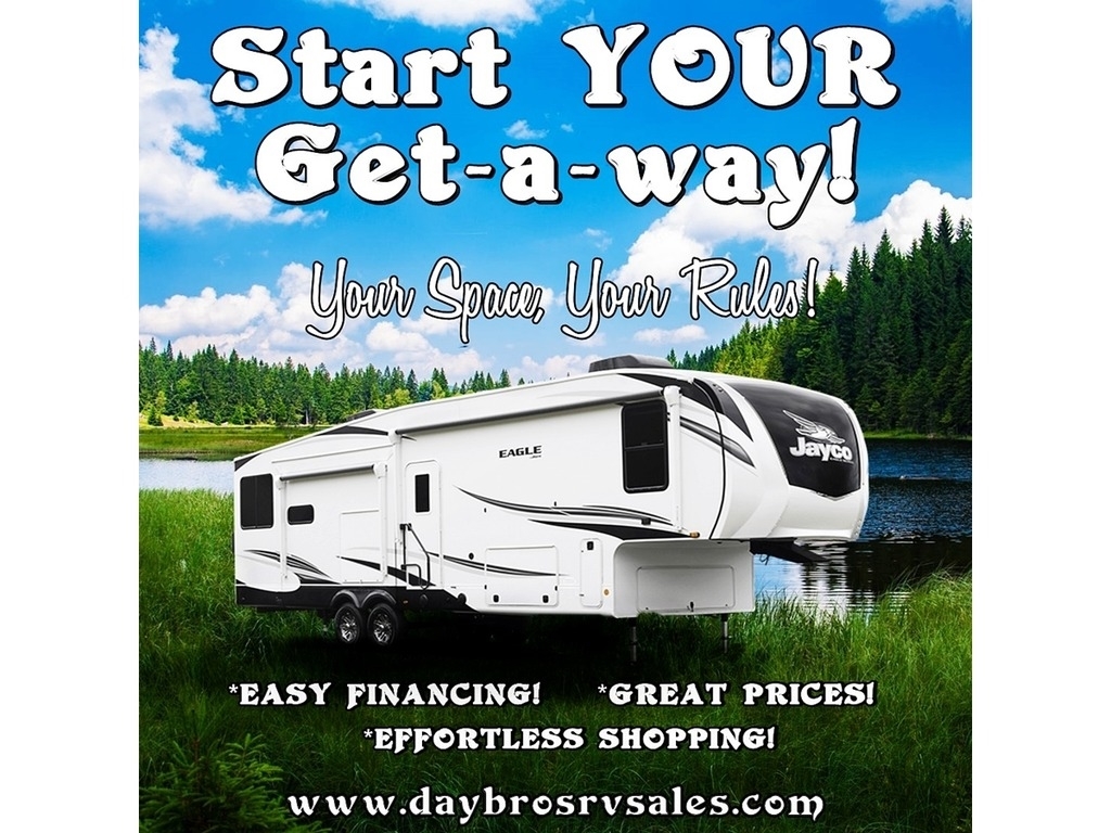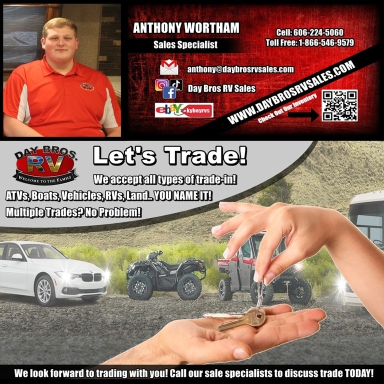 Please contact us to confirm the inventory you are interested in is still available for sale and on the premises. At any time a unit could sell (on our lot, over the phone with a holding deposit, or be at another location for an event or sale) before being updated online. If you do not confirm availability/location before hand (including before heading to our dealerships) we can not guarantee availability. All sale prices include all other incentives, offers, and rebates offered by Day Bros RV Sales or any other manufacturer unless specified in writing. All Day Bros RV Stores prices, sales, and offers are subject to change without notice and All Day Bros RV Stores reserve the right to price any unit, including those spotlighted or specially marked, before, during or after a sale or promotion of any kind or type of advertisement including that of an email blast, TV spot, written ad or any other type of advertisement at any price they wish after any sale or promotion ends to ultimately sell every unit. *(w.a.c.) Estimated payment figured at 5.99% on 20 yrs with 10% down on units above $49,001. Units below $49,000, estimated payment figured at 5.99% on 15yrs with 10% down. Price and payment do NOT include TT&L or any other fees that may apply. Used units and RVs under $50K are subject to shorter terms, higher rates, and restrictions. This information is also subject to change. Call DBRV Location's finance department for complete details. Some videos and photos may not represent the actual vehicle for sale. Manufacturer's standards and features subject to change without notice. ALL weights, measurements, sizes, etc. including, but not limited to, TVs, bed sizes, tank capacities, lengths, GVWRs, etc., are all either estimated or information provided by the manufacturer and not guaranteed to be 100% accurate by DBRV or the manufacturer due to continual product changes and enhancements. All deposits are NON-REFUNDABLE unless otherwise specified in writing. Upon receipt of deposit seller (DBRV) agrees to hold the selected unit and prepare it for delivery and orientation to the buyer. Buyer understands and agrees that by leaving said NON-REFUNDABLE deposit they are asking DBRV to prepare their purchase for delivery and orientation and should they fail to pay for their purchase by the specified delivery date they will forfeit the NON-REFUNDABLE deposit. DBRV retains the right to apply partial or all said NON-REFUNDABLE deposit to a future purchase. Online info deemed reliable, but not guaranteed. All materials are copyrighted by All Day Bros RV Stores. All rights are reserved. No part of any material on our websites may be reproduced, distributed, or transmitted in any form or by any means without the prior written permission of Day Brother's Auto/RV Sales LLC Management Team. Thank you so much for shopping with us at our Day Bros RV Stores. If you have any further questions about sale prices, promotions, finance, availability, etc. please contact the Corporate Store in London, KY or 1-866-546-9579. Thank You.
