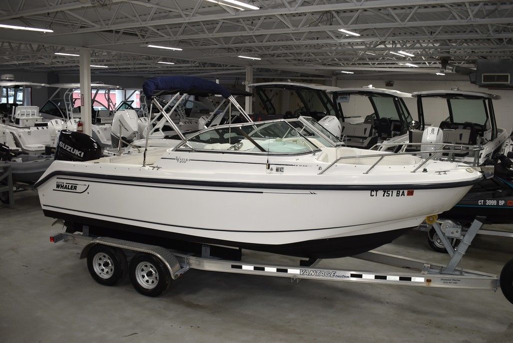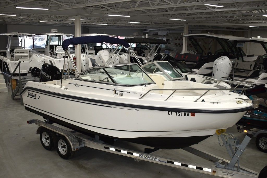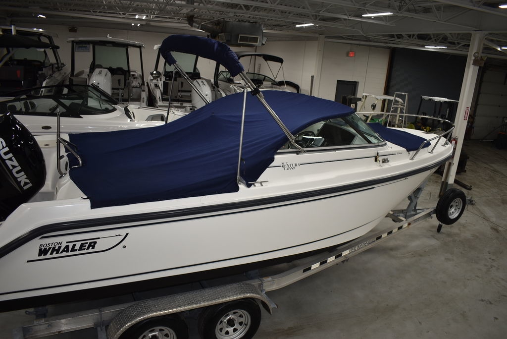 For sale by Diamond Marine of Connecticut. A just traded in 2003 Boston Whaler 210 Ventura Dual Console Fun and Fish boat. Boat was repowered in 2025 with a brand-new Suzuki 200hp 4 stoke outboard with digital controls with only 9 hours on it and free transferable warranty good till March 25th, 2032. This complete package includes a 2021 Venture I-Beam aluminum tandem axle bunk trailer with disc brakes on both axles and spare tire. Call Diamond Marine today if interested 203 466-5384.