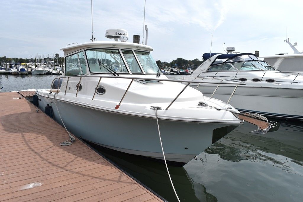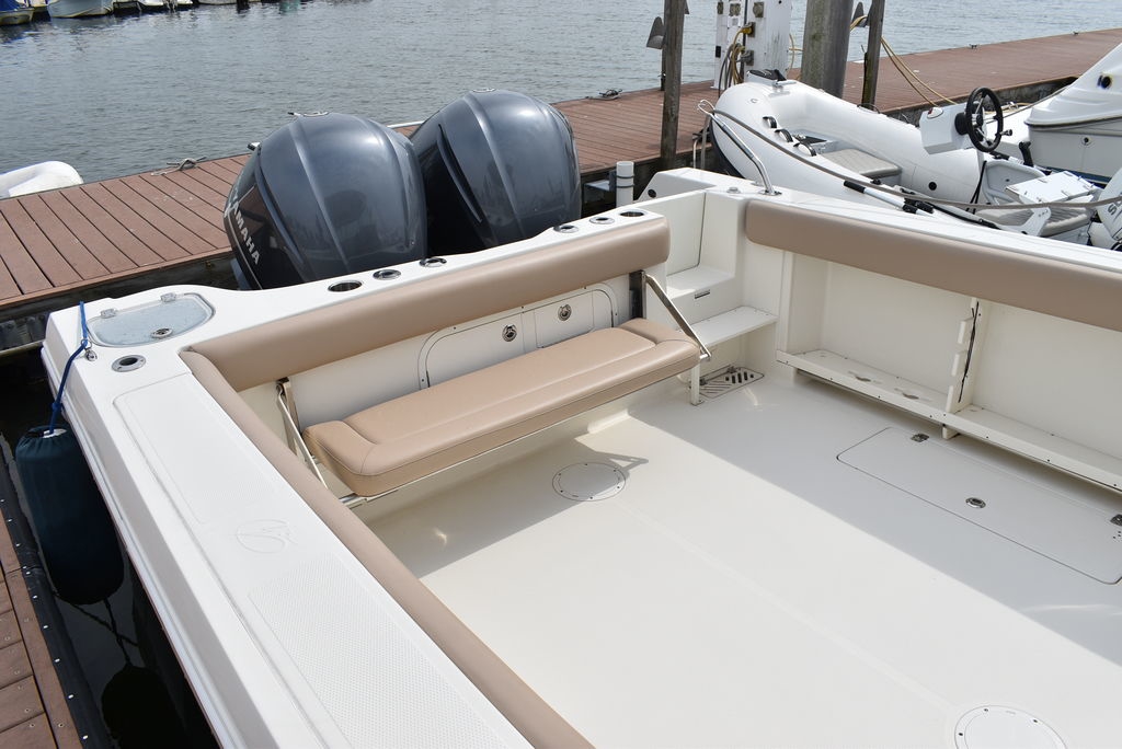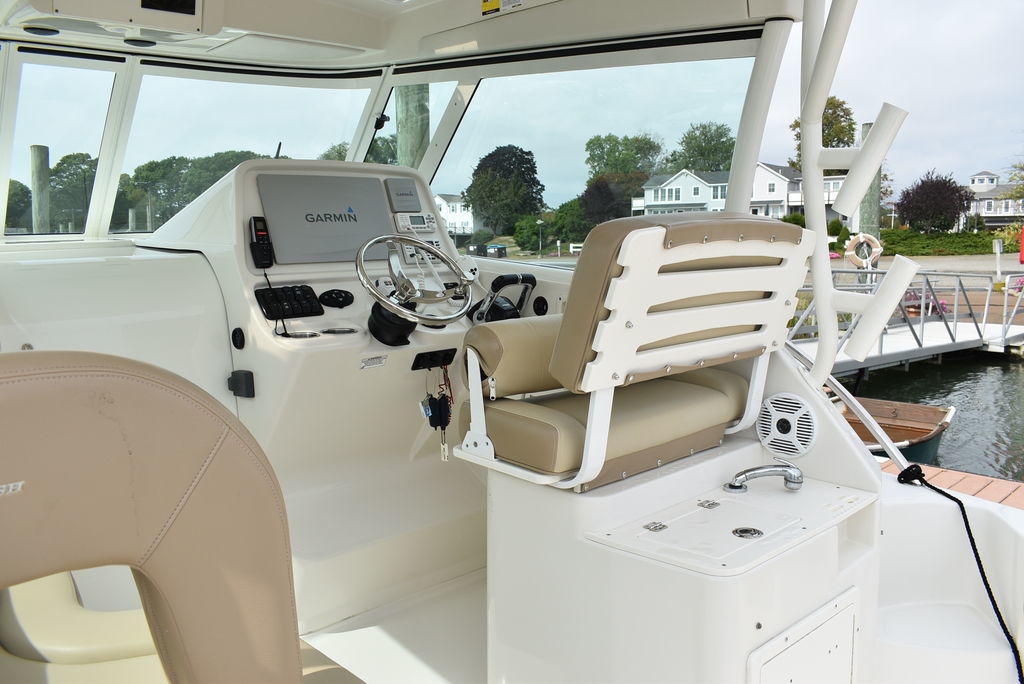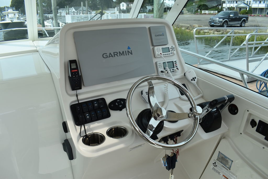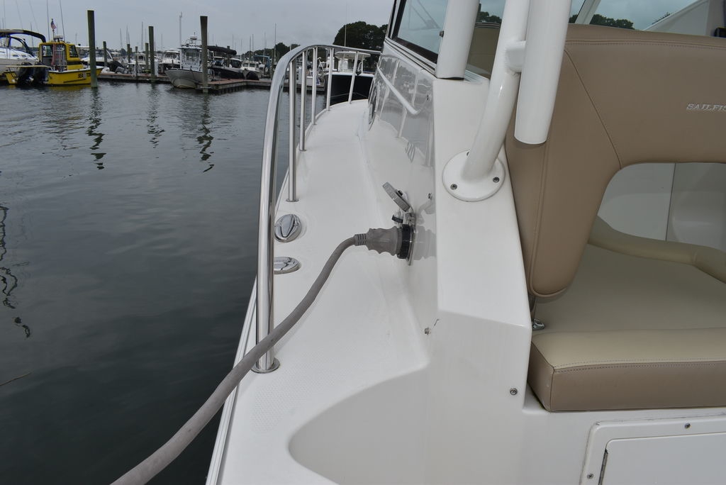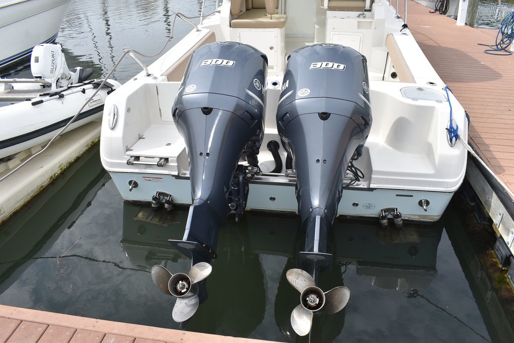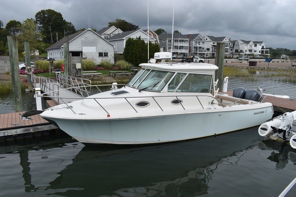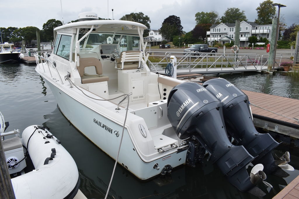 Now available, just traded in, 2017 Sailfish 320 Express Walkaround offshore fishing boat. Twin Yamaha F300HP Outboards, four stroke, 293 hours of well cared for use. Boat comes loaded with a light blue hull color, Air conditioning w/ reverse heat, Kohler Generator w/20hrs, Stand-up head compartment w/ showerhead, Galley w/ fridge, stovetop, sink, cabinets, microwave, Power assisted steering, Windlass anchor, Garmin big screen GPS/Map/Fishfinder, Garmin radar, Two VHF Radios, Autopilot, Yamaha 6Y9 Digital motor gauge, Fusion stereo w/ helm remote, Remote spotlight, Trim tabs, Sleeps 5 up front with bunk beds engaged, and two in the mid-cabin as well as one topside on passenger lounger, full enclosure for helm under the hardtop that also has an AC/ heat vent. This boat must truly be seen to appreciate how well it has been kept. Financing available, local trades welcome. Seatrial available before payment. Please contact us by email or phone at 203 466-5384 with any questions or concerns and ask for Mark or Ka