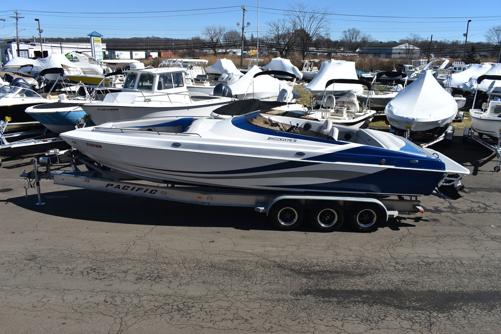 One owner, just traded in, 2020 Shockwave 29 Magnatude high performance sport boat and trailer package. Built by Shockwave Custom Boats in Corona California. Hand Laminated, with custom gel coat and renowned for its stability, speed and versatility. Complete package includes a Pacific I-Beam aluminum tri-axle trailer. Financing available, local trades welcome. Boat is on-site at Diamond Marine of Connecticut. Contact us for more information. 203 466-5384