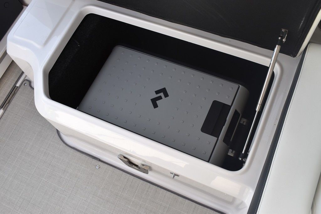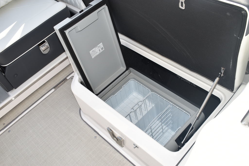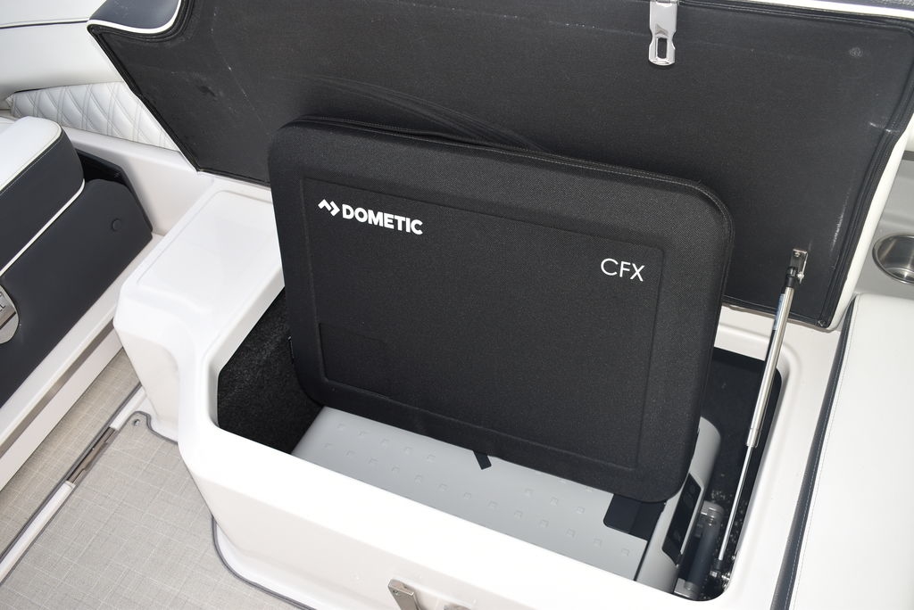 Dometic 12V-hardwired dual cooler (refrigerator/freezer zones) mounted under port main lounger w/lighted switch