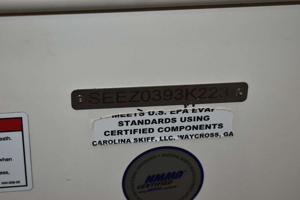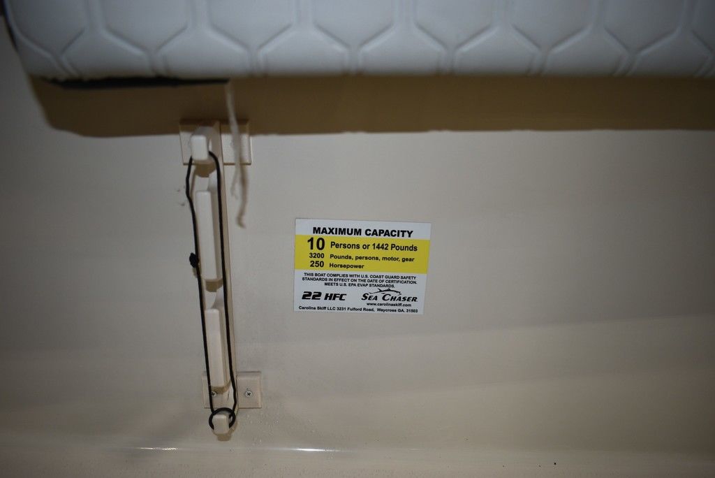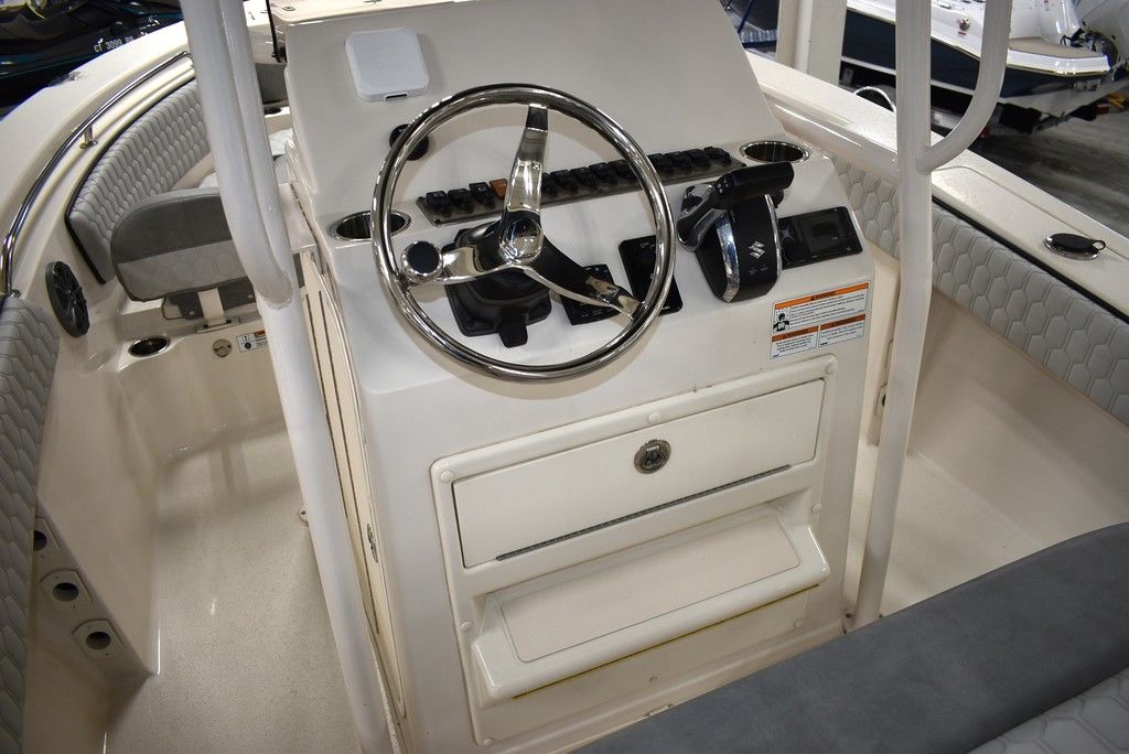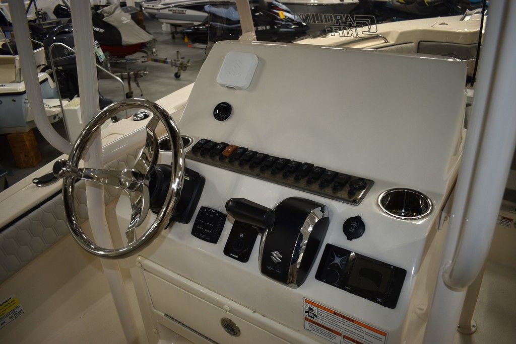2023 Sea Chaser 22HFC Center Console, Suzuki DF200hp White four stroke outboard w/ stainless steel prop. Boat was ordered with a Black hull stripe, Hardtop w/ XLarge/Flipup Console and black on underside of top, 9 Gallon freshwater tank w/shower nozzle, Polished electric trim tabs w/ indicator panel, Bow table, 4 Stainless gunnel mounted rodholders.