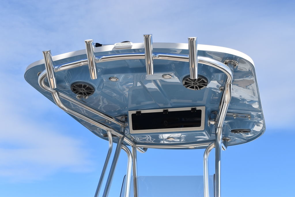 2023 Sea Chaser 24HFC Center Console, Suzuki DF300hp White four stroke outboard w/ stainless steel prop. Boat was ordered with a Evening Sky Blue hull stripe, Hardtop w/ Evening Sky undersid, Offshore console 9 Gallon freshwater tank w/shower nozzle, Polished electric trim tabs w/ indicator panel, Windlass anchor system w/ anchor, switch, bow roller 100ft of rope, Bow table, Electric flushable head, Sea Star power assist steering.