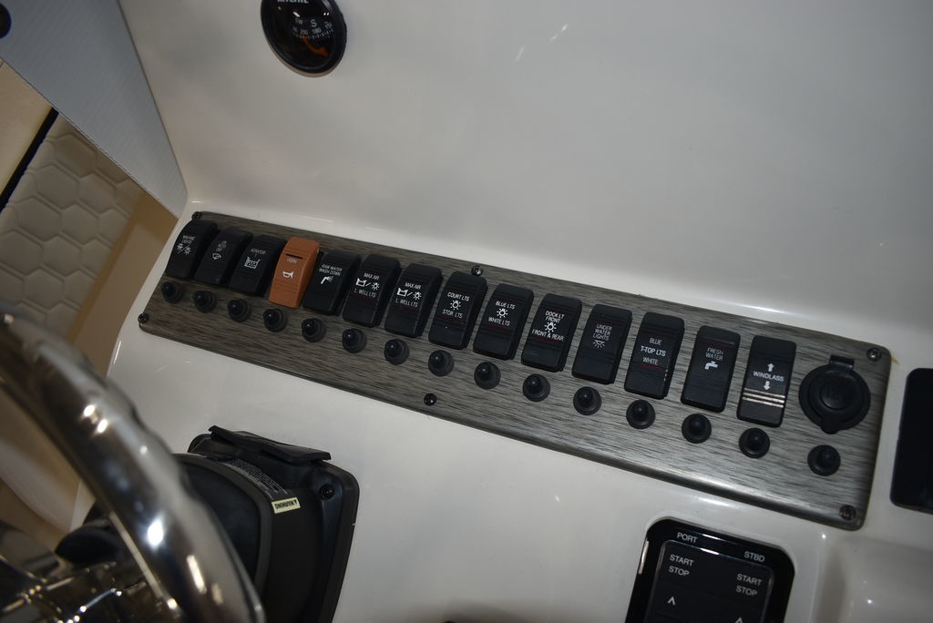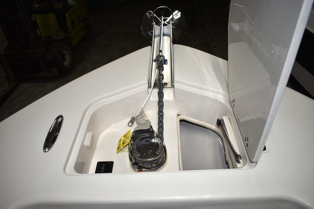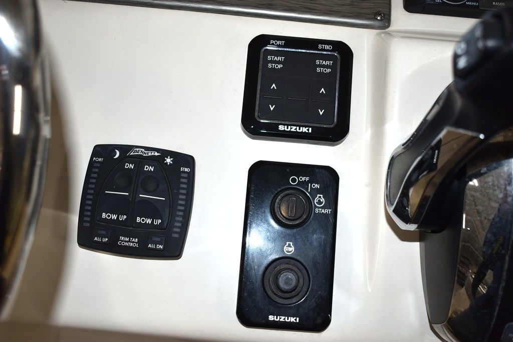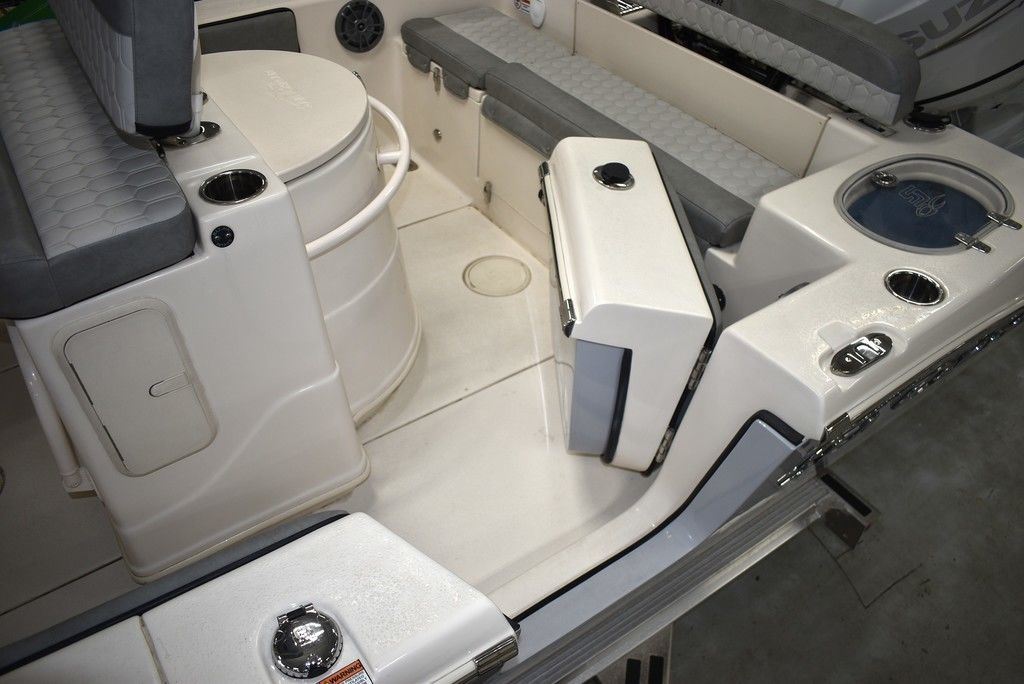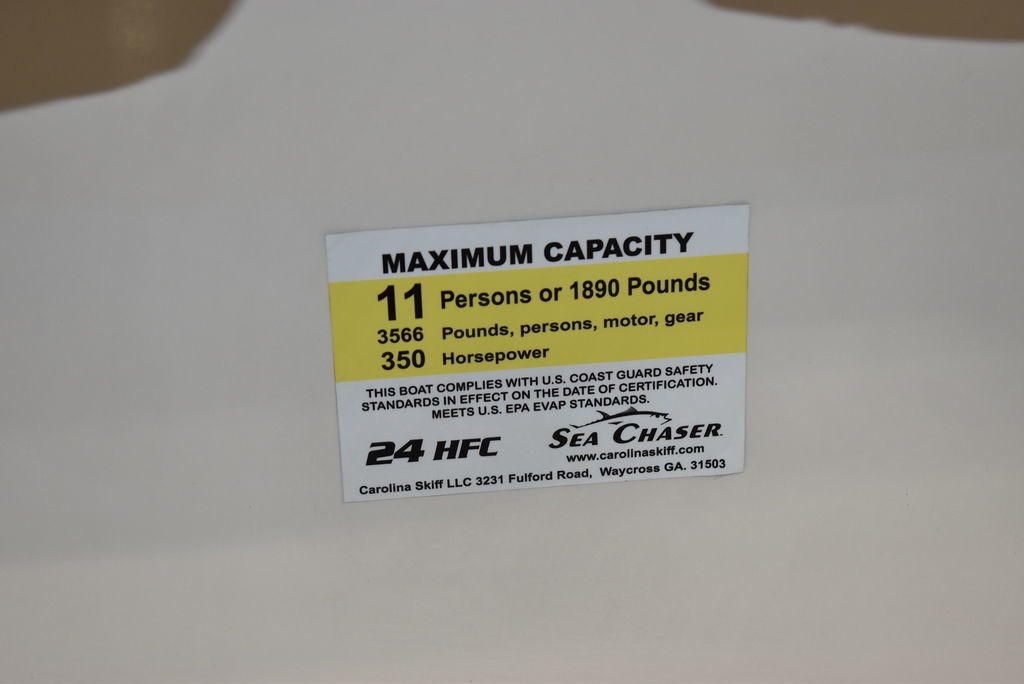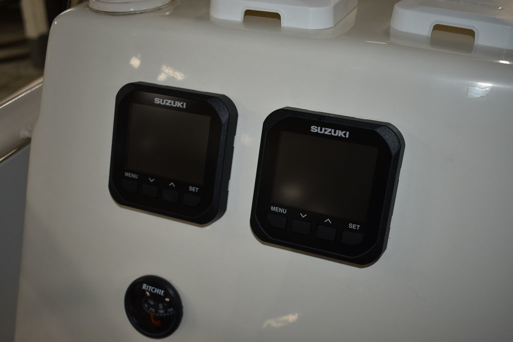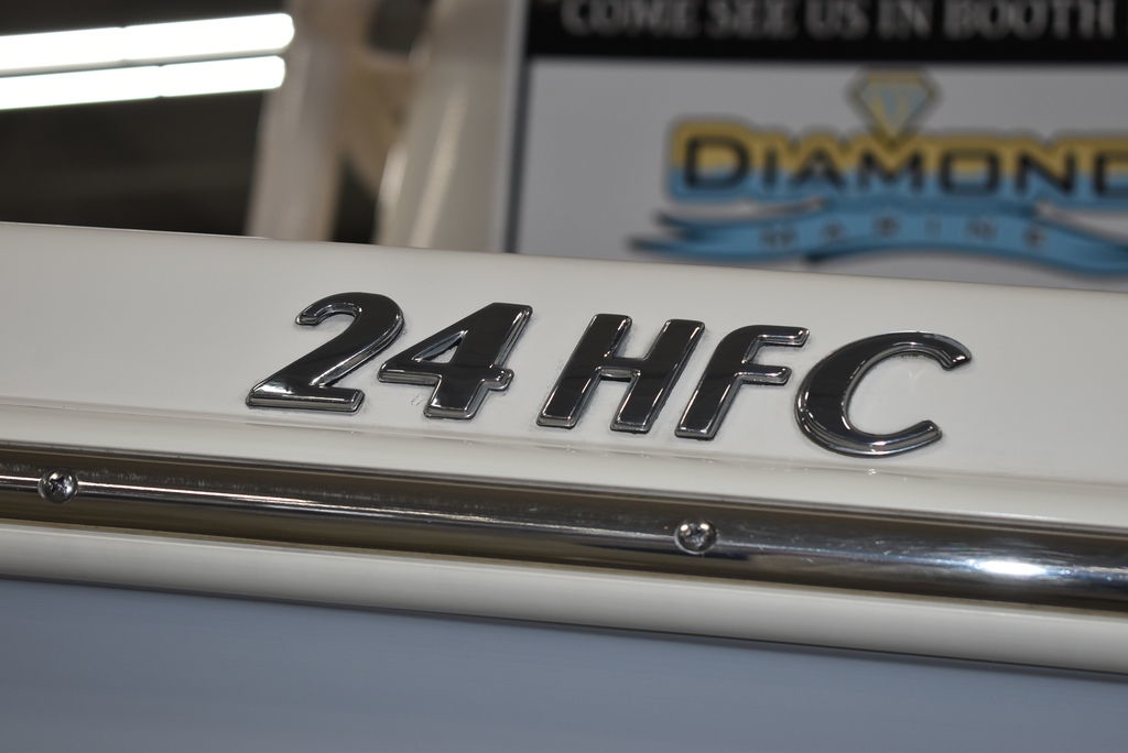 This 24 HFS was ordered with the following options. Twin Suzuki 150 Digital white outboards, Grey sport stripe, Hardtop w/ powder coat framing, 9 Gallon freshwater, Electric trim tabs w/ indicators, Fiberglass leaning post w/ livewell, Windlass anchor, Bow table, Electric flushable head, U.S. Coast guard pkg.