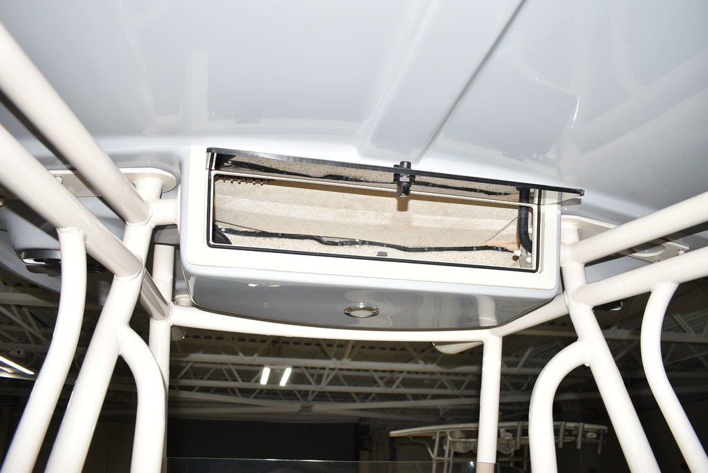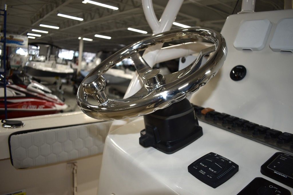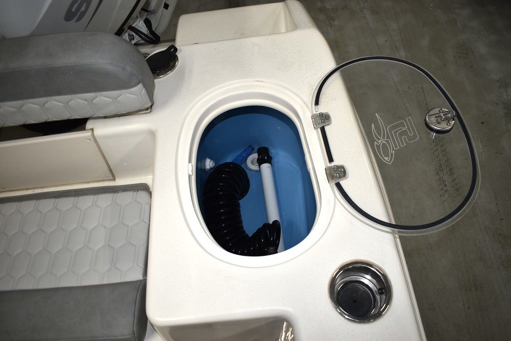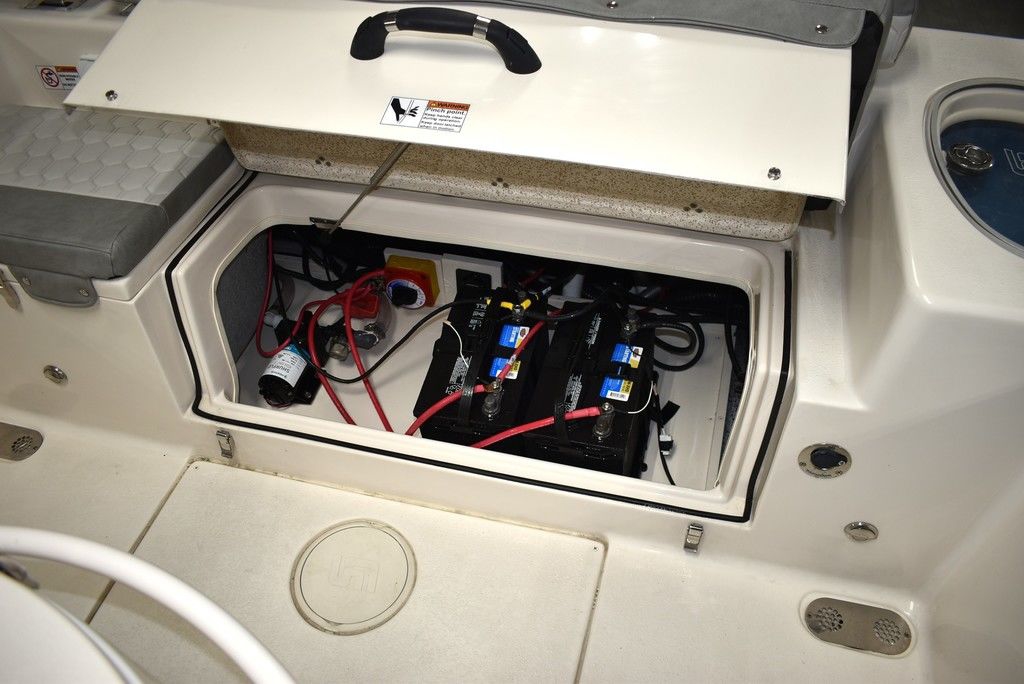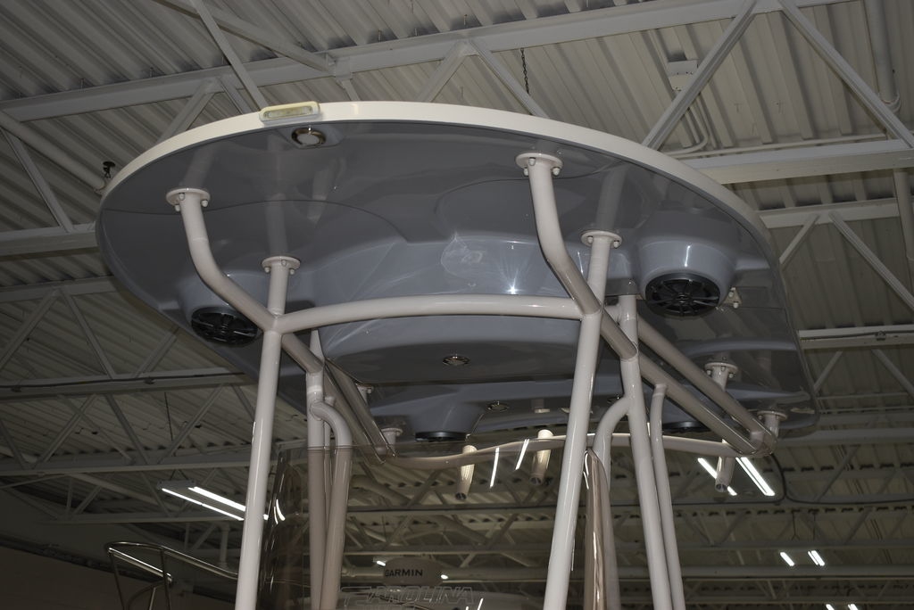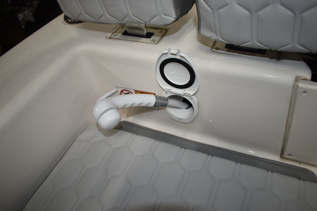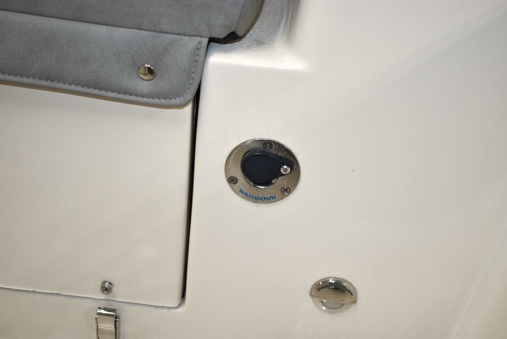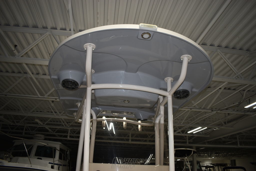This 24 HFS was ordered with the following options. Twin Suzuki 150 Digital white outboards, Grey sport stripe, Hardtop w/ powder coat framing, 9 Gallon freshwater, Electric trim tabs w/ indicators, Fiberglass leaning post w/ livewell, Windlass anchor, Bow table, Electric flushable head, U.S. Coast guard pkg.