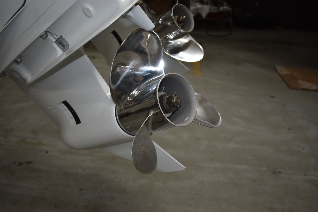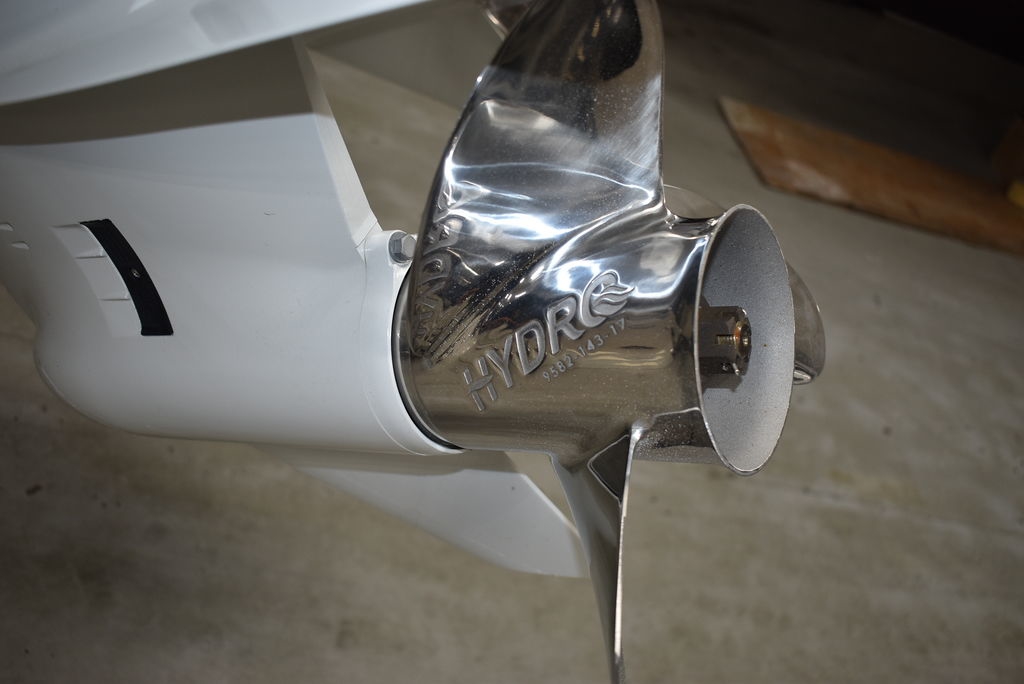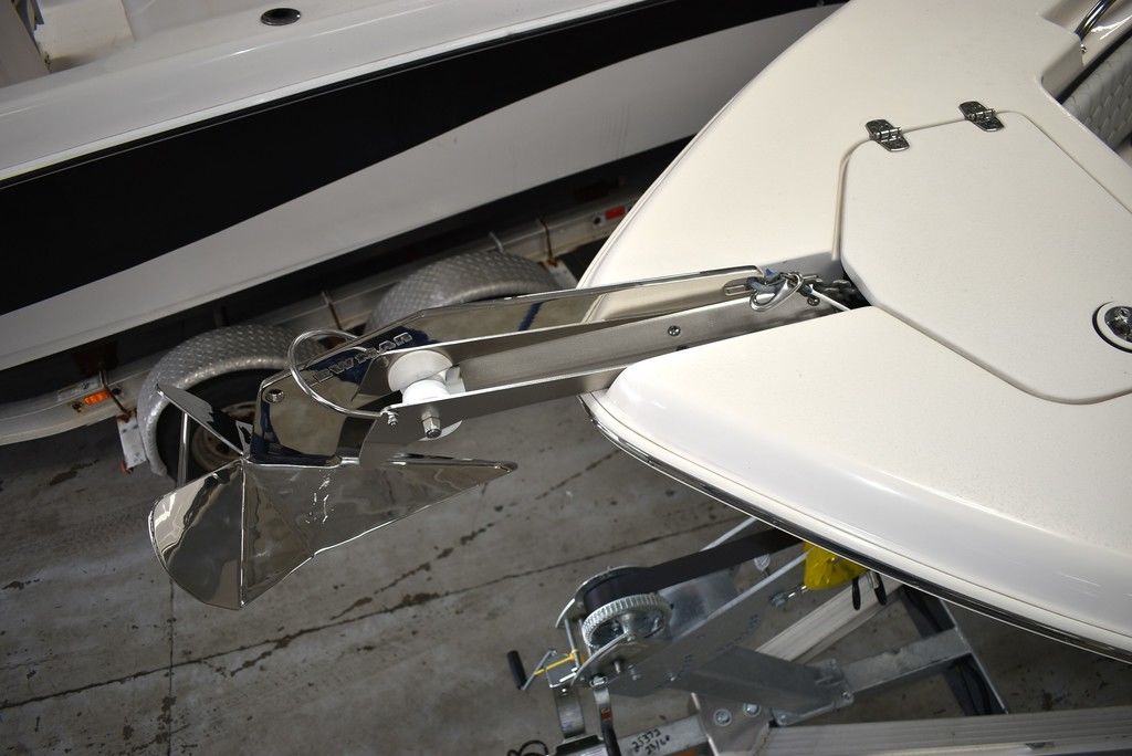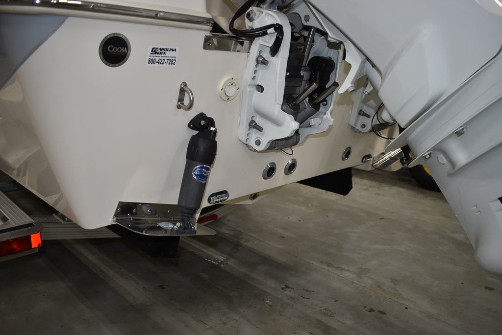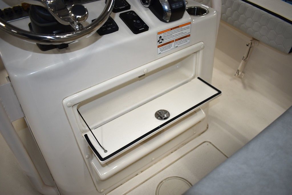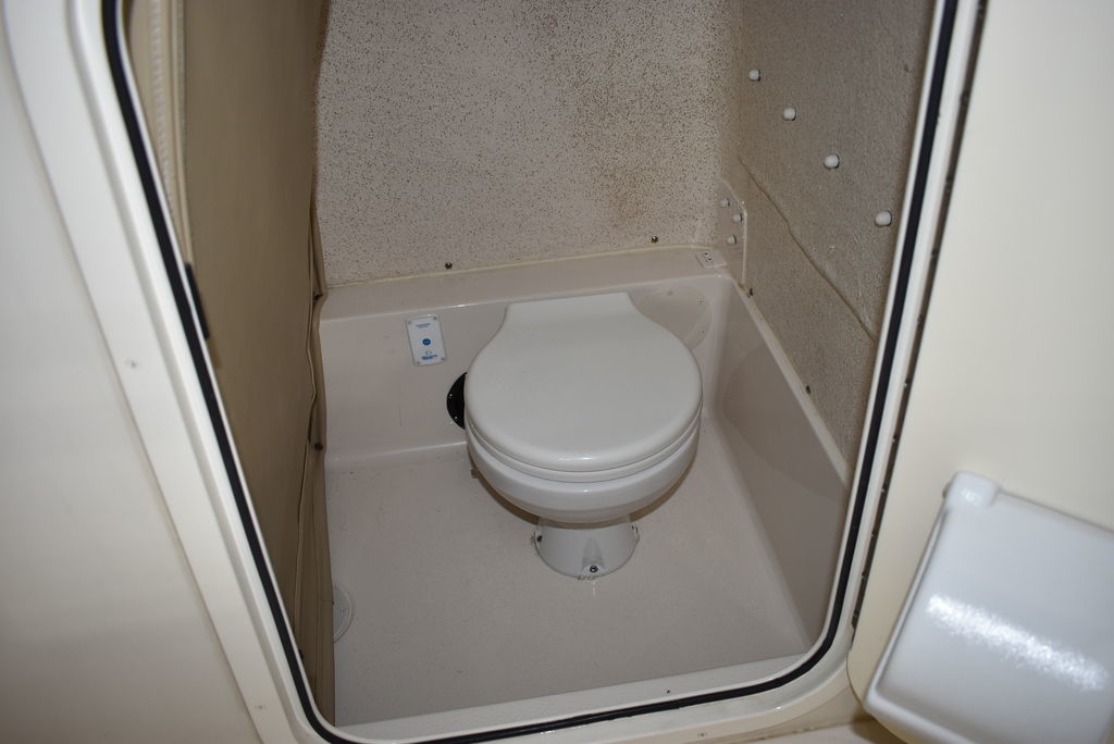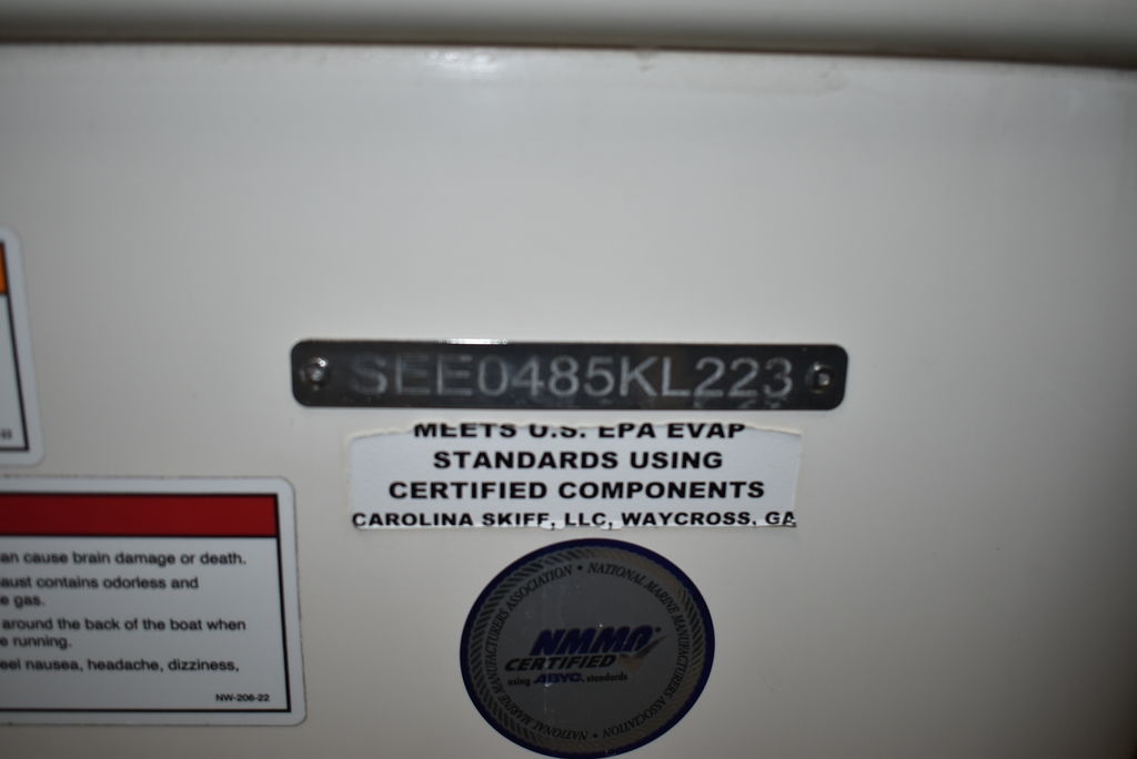 This 24 HFS was ordered with the following options. Twin Suzuki 150 Digital white outboards, Grey sport stripe, Hardtop w/ powder coat framing, 9 Gallon freshwater, Electric trim tabs w/ indicators, Fiberglass leaning post w/ livewell, Windlass anchor, Bow table, Electric flushable head, U.S. Coast guard pkg.