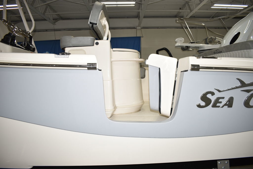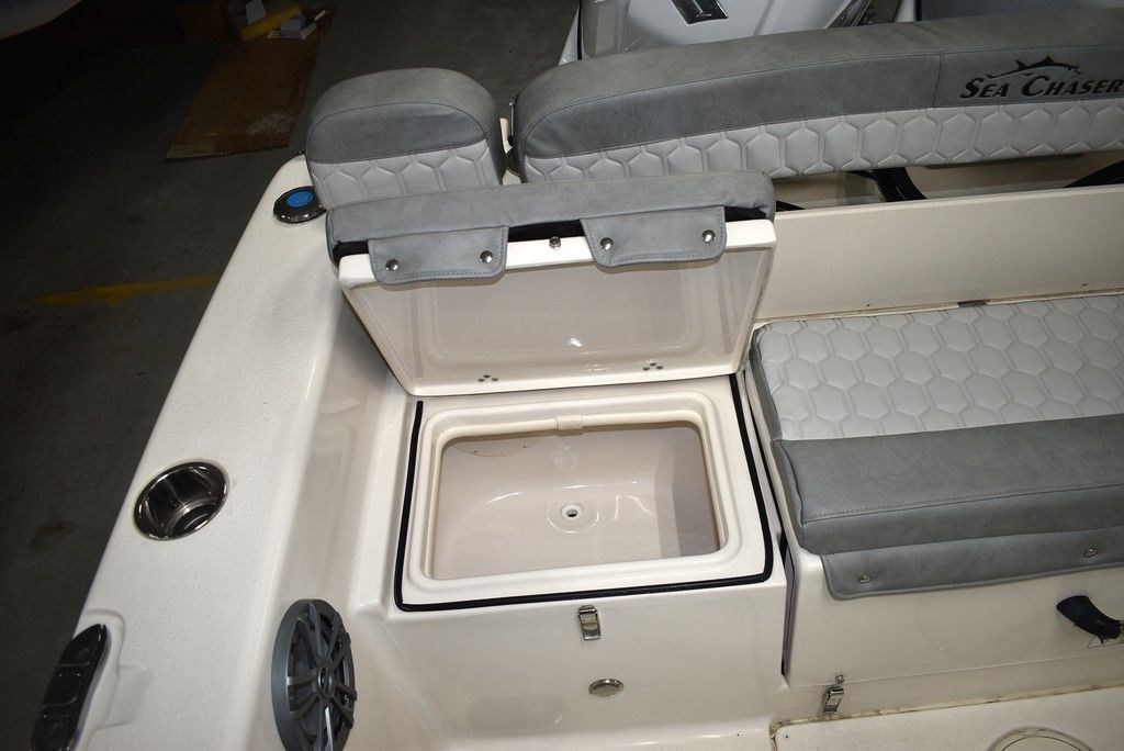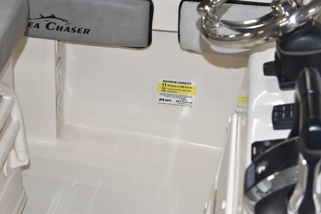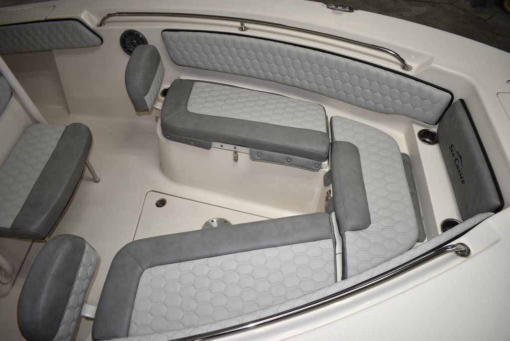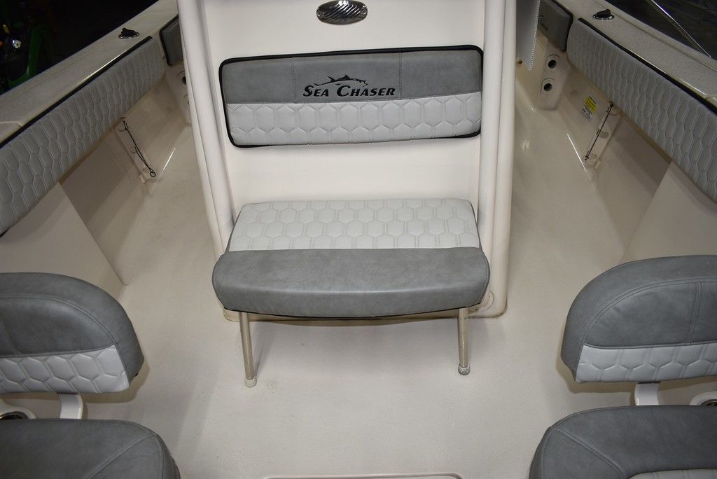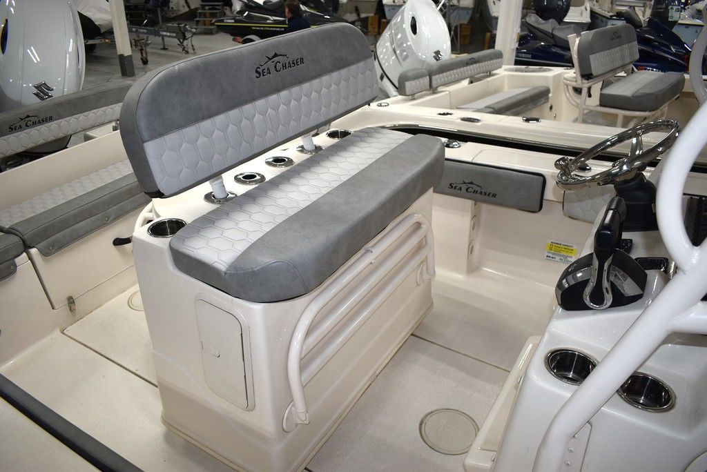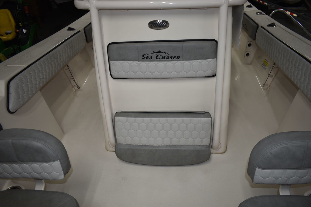 Whether you're heading offshore for fishing, exploring the coast or pulling a tube for family fun, the 2023 model year 24 HFC checks every box for on-the-water adventure. For boaters who love to raft up and swim, the 24 HFC comes standard with a portside entry door and a stern telescoping ladder for easy and safe access in and out of the water. Throughout the 24 HFC, find only the highest-quality stainless steel components, such as flush-mounted cup holders, rod holders and fold-down cleats. For fishing enthusiasts, keep more bait onboard inside the built-in 25-gallon stern baitwell, which easily doubles as dry storage when needed. Families and charter captains have plenty of room onboard the 24 HFC with the spacious U-shaped bow seating area, console front passenger seat and stern bench seat with a removable backrest. Contact your nearest Sea Chaser dealer today to see the 2023 model year 24 HFC!