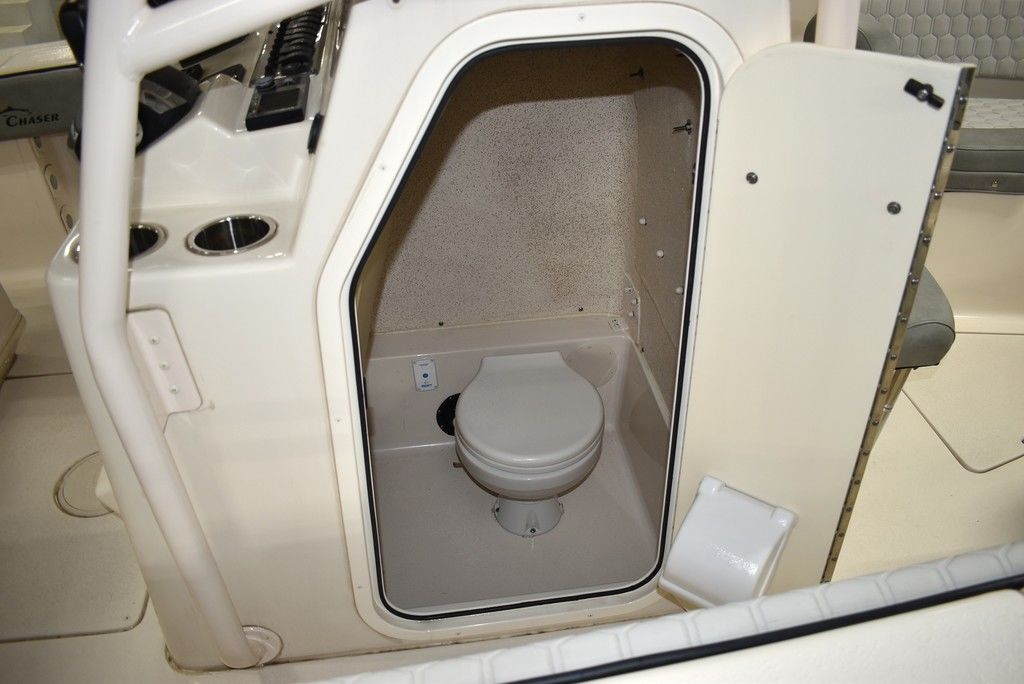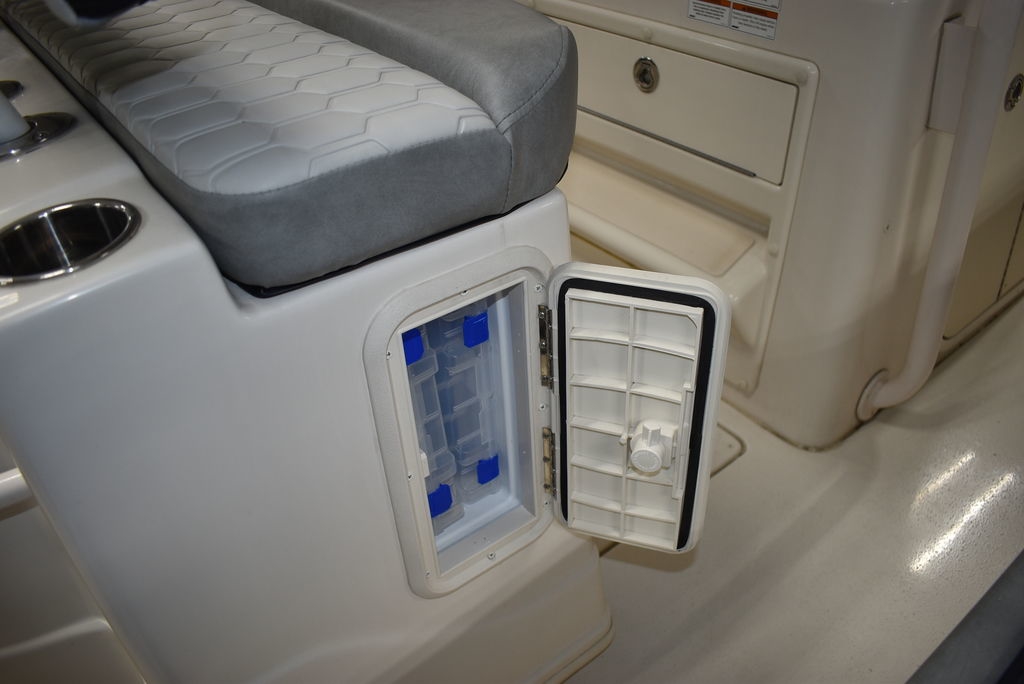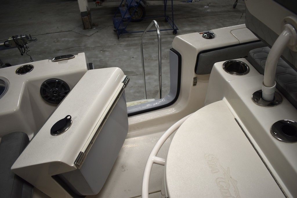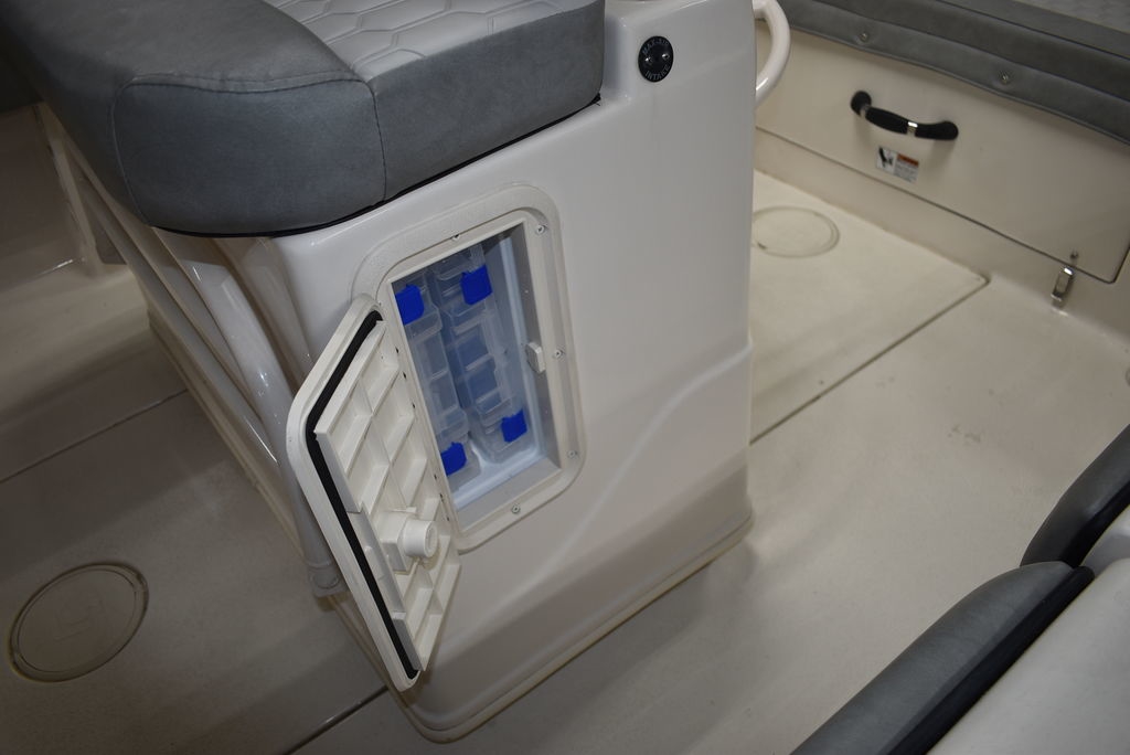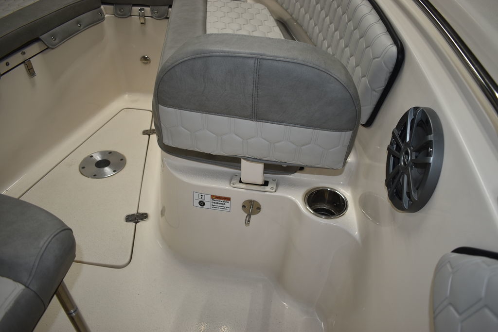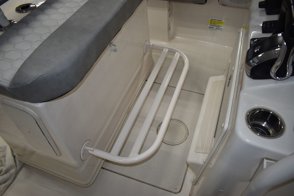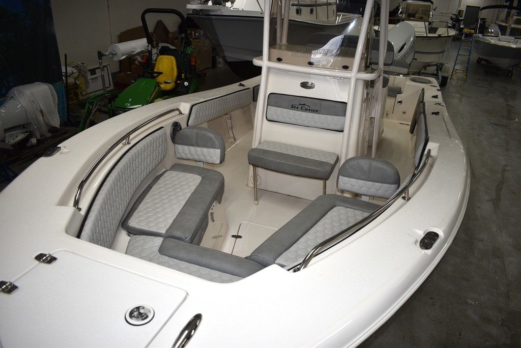 Whether you're heading offshore for fishing, exploring the coast or pulling a tube for family fun, the 2023 model year 24 HFC checks every box for on-the-water adventure. For boaters who love to raft up and swim, the 24 HFC comes standard with a portside entry door and a stern telescoping ladder for easy and safe access in and out of the water. Throughout the 24 HFC, find only the highest-quality stainless steel components, such as flush-mounted cup holders, rod holders and fold-down cleats. For fishing enthusiasts, keep more bait onboard inside the built-in 25-gallon stern baitwell, which easily doubles as dry storage when needed. Families and charter captains have plenty of room onboard the 24 HFC with the spacious U-shaped bow seating area, console front passenger seat and stern bench seat with a removable backrest. Contact your nearest Sea Chaser dealer today to see the 2023 model year 24 HFC!